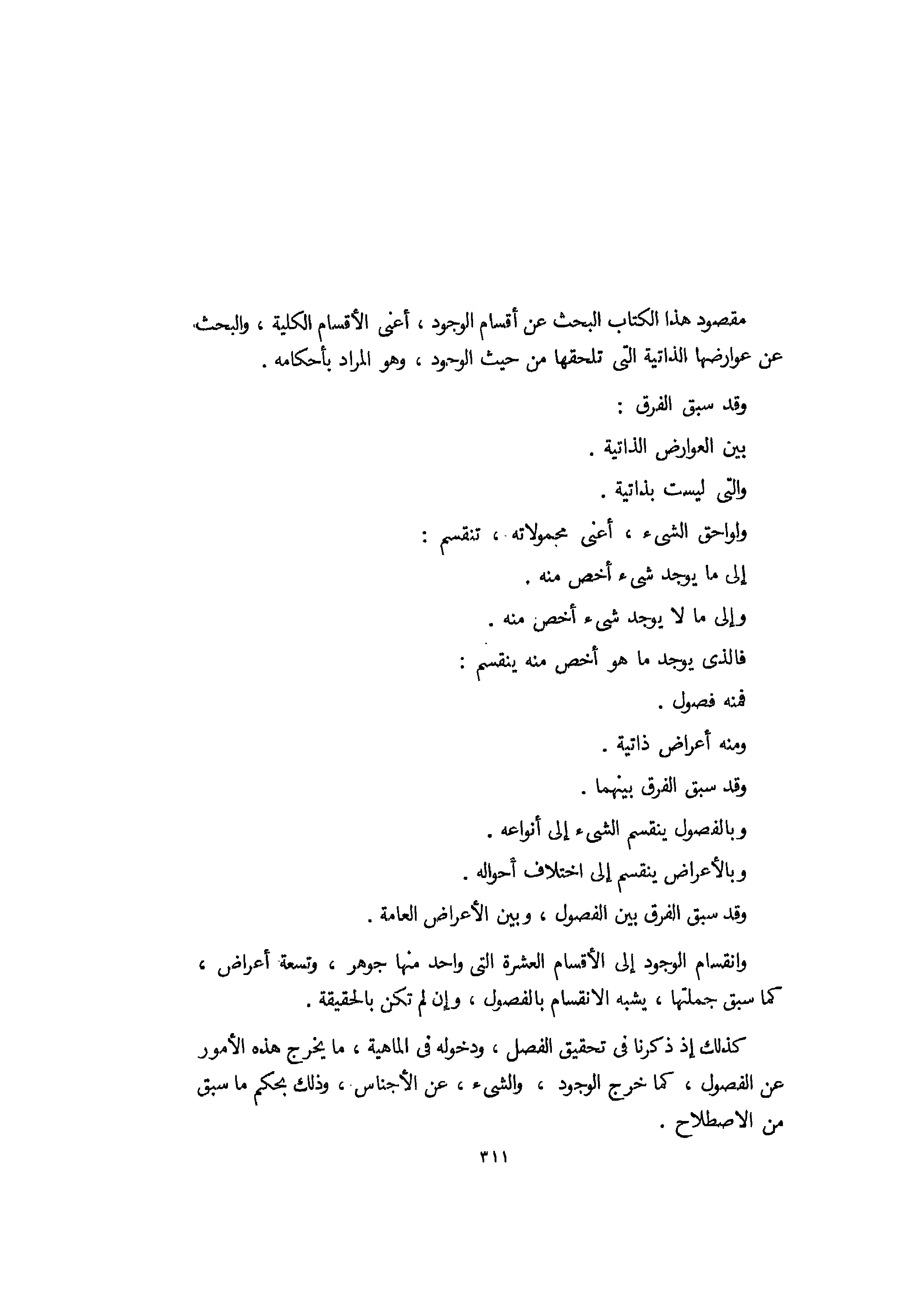 مقصود هذا الكتاب البحث عن أقسام الوجود، اعني الأقسام الكلية والبحث عن عوارضها الذاتية التي تلحقها من حيث الوجود، وهو المراد بأحكامه وقد سبق الفرق بين العوارض الذاتية والتي ليست بذاتية، ولواحق الشيء أعني محمولاته تنقسم إلى ما يوجد شيء أخص منه، وإلى ما لا يوجد شيء أخص منه، فالذي يوجد ما هو أخص منه ينقسم، فمنه فصول منه أعراض ذاتية، وقد سبق الفرق بينهما. وبالفصول ينقسم الشيء إلى أنواعه، وبالأعراض ينقسم إلى اختلاف أحواله، وقد سبق الفرق بين الفصول وبين الأعراض العامة، وإنقسام الوجود إلى الأقسام العشرة التي واحد منها جوهر وتسعة أعراض كما سبق، جملتها يشبه الإنقسام بالفصول وإن لم تكن بالحقيقة كذلك، إذ ذكرنا في تحقيق الفصل ودخوله في الماهية ما يخرج هذه الأمور عن الفصول، كما خرج الوجود والشيء عن الأجناس، وذلك بحكم ما سبق من الإصطلاح.