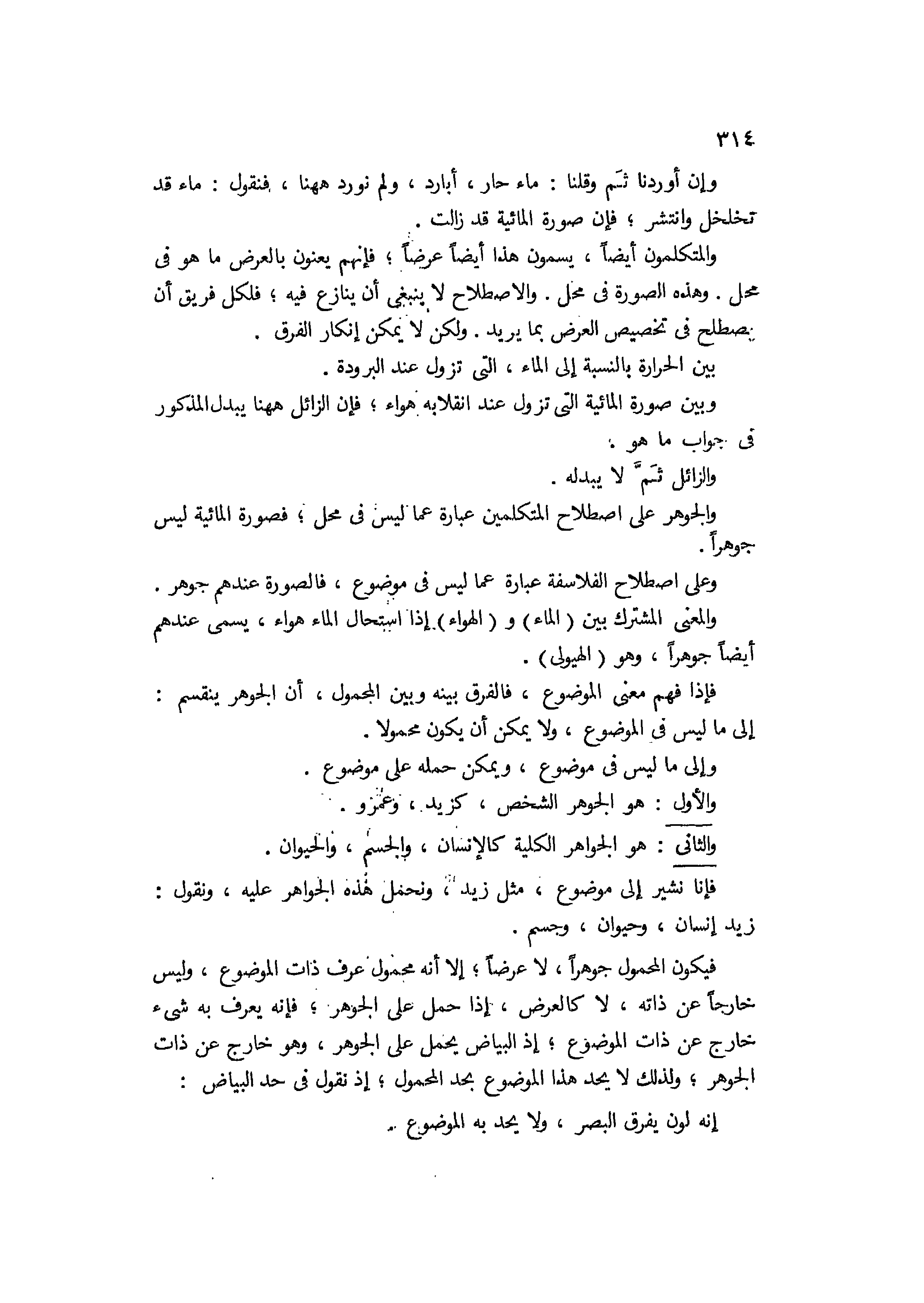 والمتكلمون أيضا يسمون هذا أيضا عرضا، فإنهم يعنون بالعرض ما هو في محل، وهذه الصورة في محل والإصطلاح لا ينبغي أن ينازع فيه، فلكل فريق أن يصطلح في تخصيص العرض بما يريد، ولكن لا يمكن إنكار الفرق بين الحرارة بالنسبة إلى الماء التي تزول عند البرودة، وبين صورةالمائية التي تزول عند إنقلابه هواءن فإن الزائل ههنا يبدل المذكور في جواب ما هو والزائل لثم لا يبدله. والجوهر على إصطلاح المتكلمين عبارة عما ليس في محل، فصورة عندهم جوهر والمعنى المشترك بين الماء والهواء إذا استحال الماء هواء يسمى عندهم أيضا جوهرا وهو الهيولي، فإذا فهم معنى الموضوع، فالفرق بينه وبين المحمول إن الجوهر ينقسم إلى مال يس في الموضوع، ولا يمكن أن يكون محمولا، وإلى ما ليس في موضوع، ويمكن حمله على موضوع. والأول هو الجوهر الشخصي كزيد وعمرو. والثاني هو الجواهر الكلية كالإنسان والجسم والحيوان، فإنا نشير إلى موضوع مثل زيد ونحمل هذه الجواهر عليه، وتقول زيد إنسان وحيوان وجسم، فيكون المحمول جوهرا لا عرضا غلا أنه محمول عرف ذات الموضوع، وليس خارجا عن ذاته، لا كالعرض إذا حمل على الجوهر فإنه يعرف به شيء خارج عن ذاته، لا كالعرض إذا حمل على الجوهر فإنه يعرف به شيء خارج عن ذات الموضوع، إذ البياض يحملعلى الجوهر وهو خارج عن ذات الجوهر، ولذلك لا يحد هذا الموضوع بحد المحمول، إذ تقول في حد البياض: إنه لو يفرق البصر ولا يحد الموضوع.