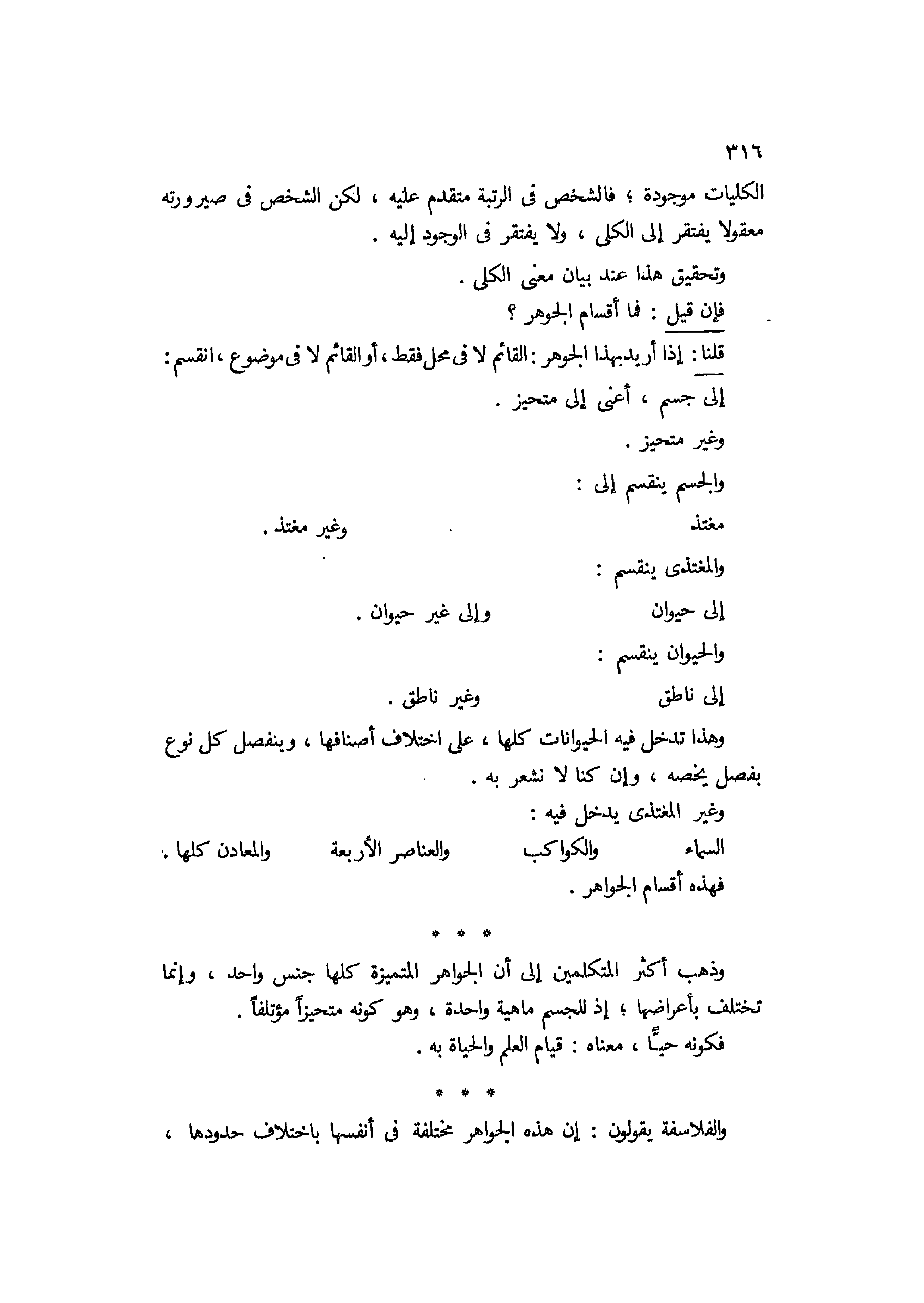 الكليات موجودةن فالشخص في الرتبة متقدم عليه، لكن الشخص في صيرورته معقولا يفتقر إلى الكلي ولا يفتقر ف يالوجود إليه، وتحقيق هذا عند بيان معنى الكلي. فإن قيل: فما أقسام الجوهر؟ قلنا: إذا أريد بهذا الجوهر القائم لا في محل فقط أو القائم لا في موضوع انقسم إلى جسم، أعني إلى متحيز وغير متحيز، والجسم ينقسم إلى مغتذ وغير مغتذ. والمغتذي ينقسم إلى حيوان وإلى غير حيوان. والحيوان ينقسم إلى ناطق وغير ناطق، وهذا تدخل فيه الحيوانات كلها على اختلاف أصنافها، وينفصل كل نوع بفصل يخصه وإن كنا لا نشعر به. وغير المغتذي يدخل فيه السماء والواكب والعناصر الأربعة والمعادن كلها؛ فهذه أقسام الجواهر.
