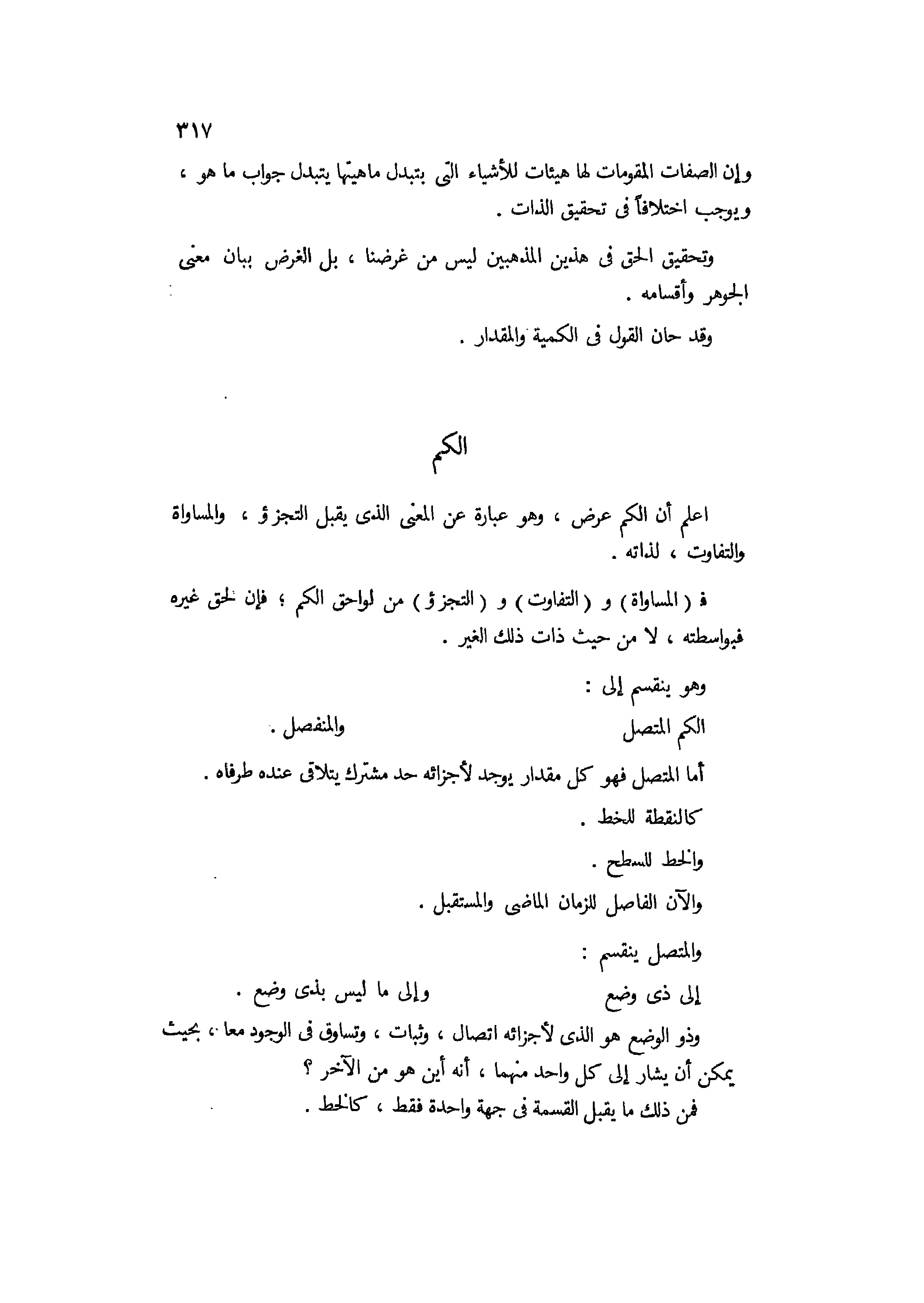 اعلم أن الكم عرض، وهو عبارة عن المعنى الذي يقبل التجزؤ والمساواة والتفاوت لذاته، فالمساواة والتفاوت والتجزؤ من لواحق الكم، فإن لحق غيره فبواسطته لا من حيث ذات ذلك الغير، وهو ينقسم إلى الكم المتصل والمنفصل.