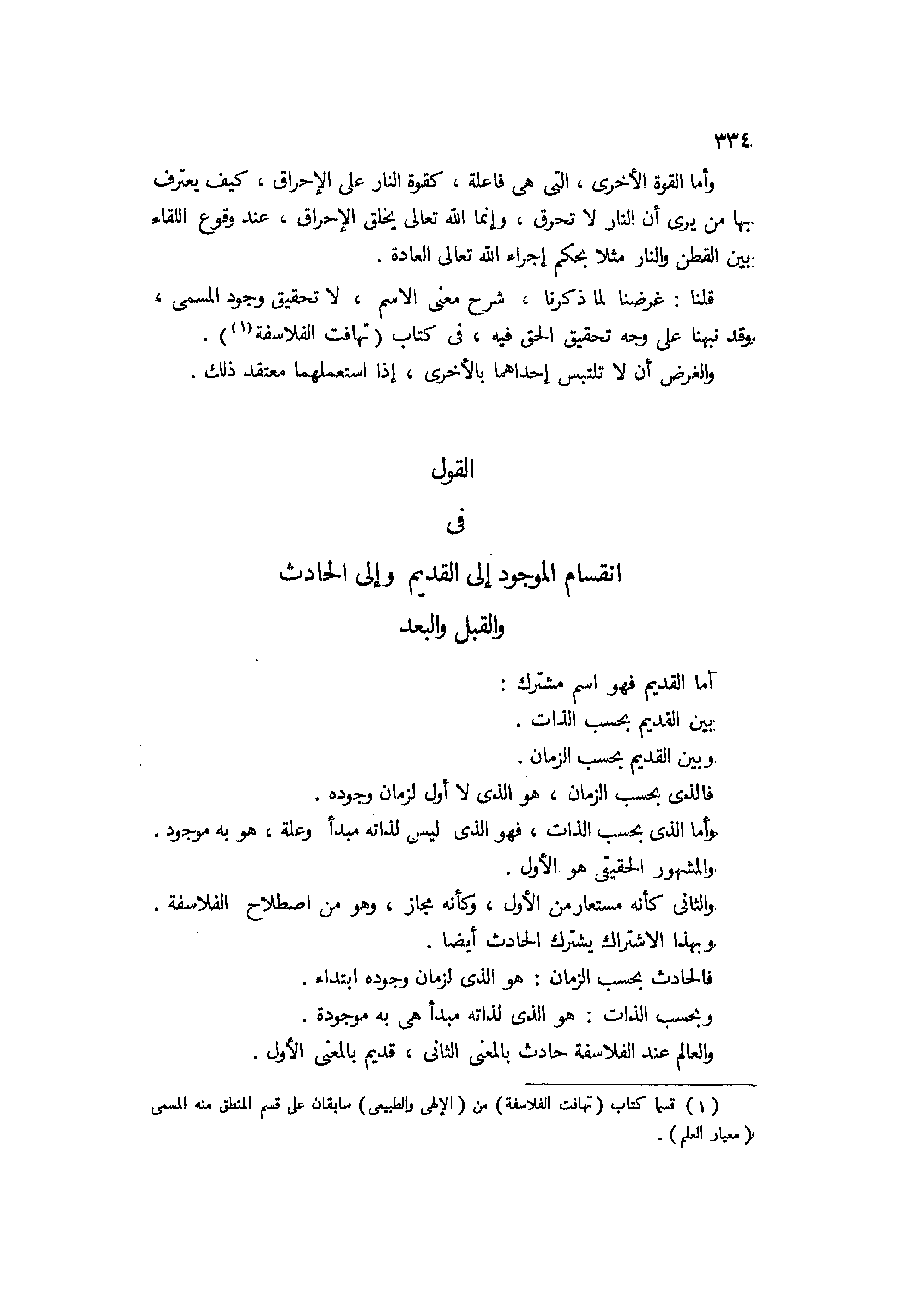 أما القديم فهو إسم مشترك بين القديم بحسب الذات وبين القديم بحسب الزمان، فالذي بحسب الزمان هو الذي لا أول لزمان وجوده، وأما الذي بحسب الذات فهو الذي ليس لذاته مبدأ وعلة هو به موجود، والمشهور الحقيقي هو الأول، والثاني كأنه مستعار من الأول، وكأنه مجاز، وهو من إصطلاح الفلاسفة، وبهذا الإشتراك يشترك الحادث أيضا، فالحادث بحسب الزمان هو الذي لزمان وجوده إبتداء، وبحسب الذات هو الذي لذاته مبدأ هي به موجودة. والعالم عند الفلاسفة حادث بالمعنى الثاني قديم بالمعنى الأول،
