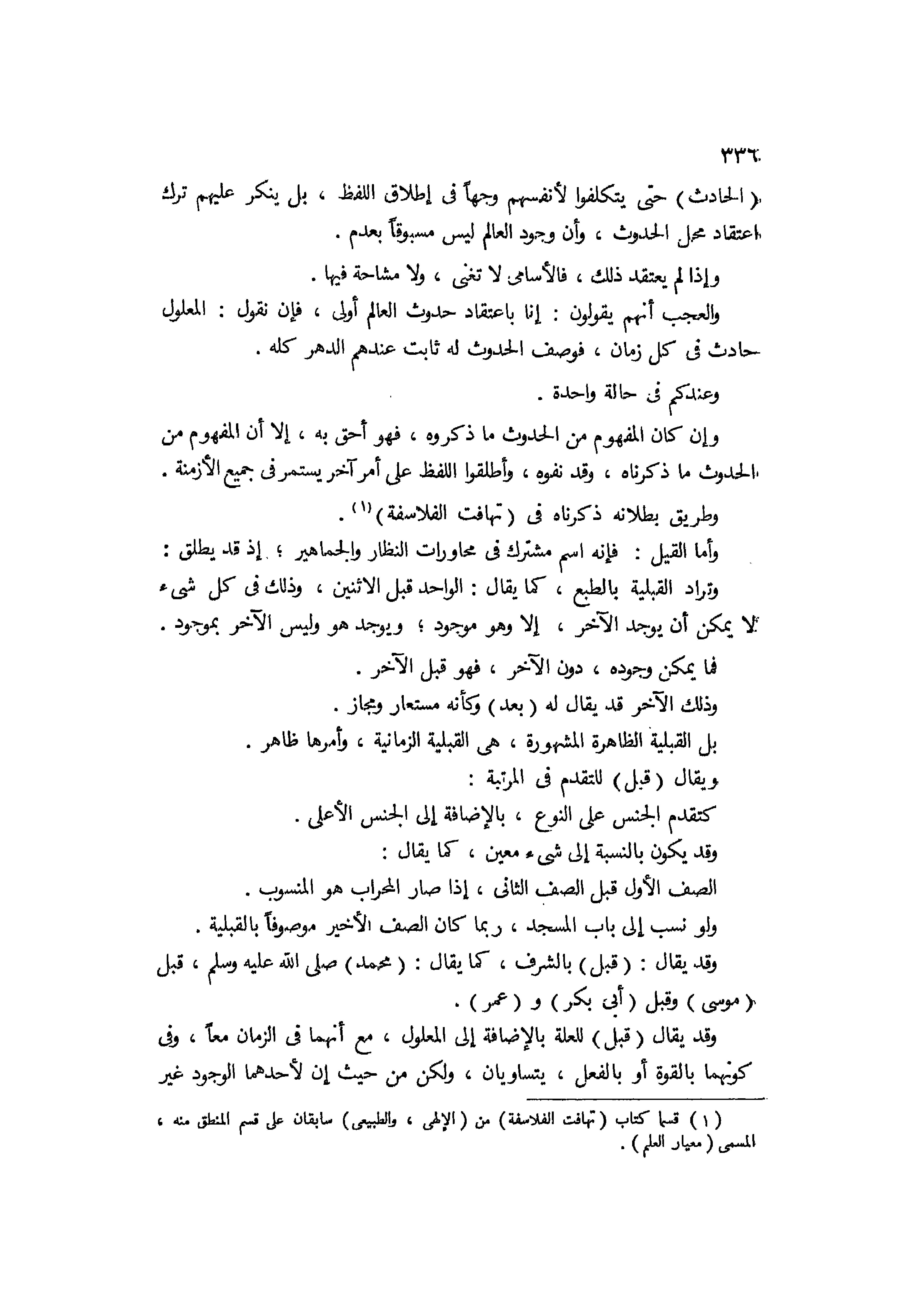 وأما القبل فإنه إسم مشترك في محاورات النظار والجماهير، إذ يطلق وتراد القبلية بالطبع كما يقال الواحد قبل الإثنين، وذلك في كل شيء لا يمكن أن يوجد الآخر إلا وهو موجود، ويوجد هو وليس الآخر بموجود، فما يمكن وجوده دون الآخر فهو قبل الآخر، وذلك الآخر، قد يقال له بعد وكأنه مستعار ومجاز، بل القبلية الظاهرة المشهورة هي القبلية الزمانية، وأمرها ظاهر، ويقال قبل للتقدم في المرتبة كتقدم الجنس على النوع بالإضافة إلىالجنس الأعلى، وقد يكون بالنسبة إلى شيء معين كما يقال الصف الأول قبل الصف الثاني، إذا صار المحراب هو المنسوب، ولو نسب إلى باب المسجد ربما كان الصف الأخير موصوفا بالقبلية، وقد يقال قبل بالشرف كما يقال محمد صلى الله عليه وسلم قبل موسى، وقبل أبي بكر وعمر وقد يقال قبل للعلة بالإضافة إلى المعلول مع أنهما في الزمان معا وفي كونهما بالقوة أو بالفعل يتساويان، ولكن من حيث أن لأحدهما الوجود غير