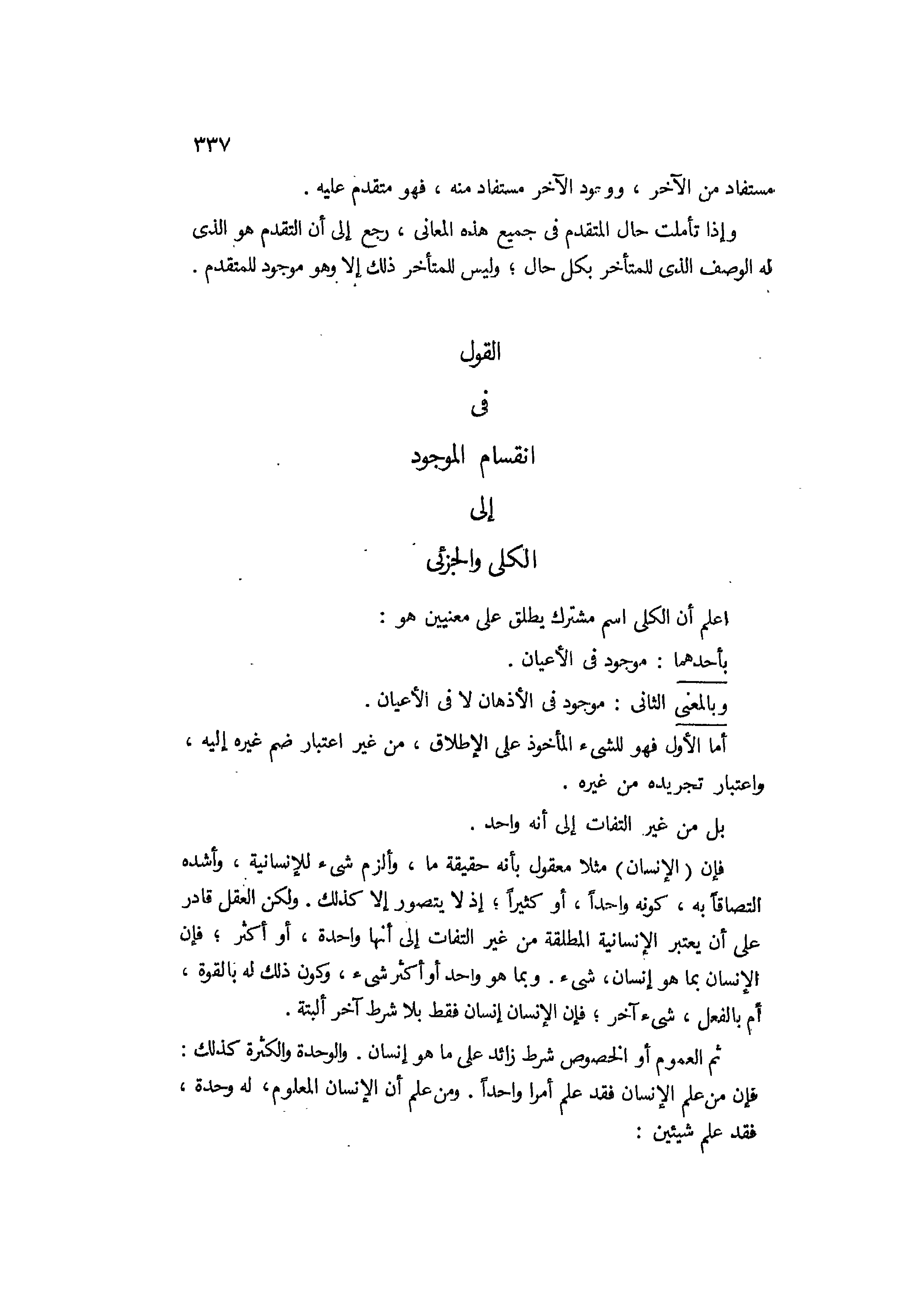 القول في إنقسام الموجود إلى الكلي والجزئي
