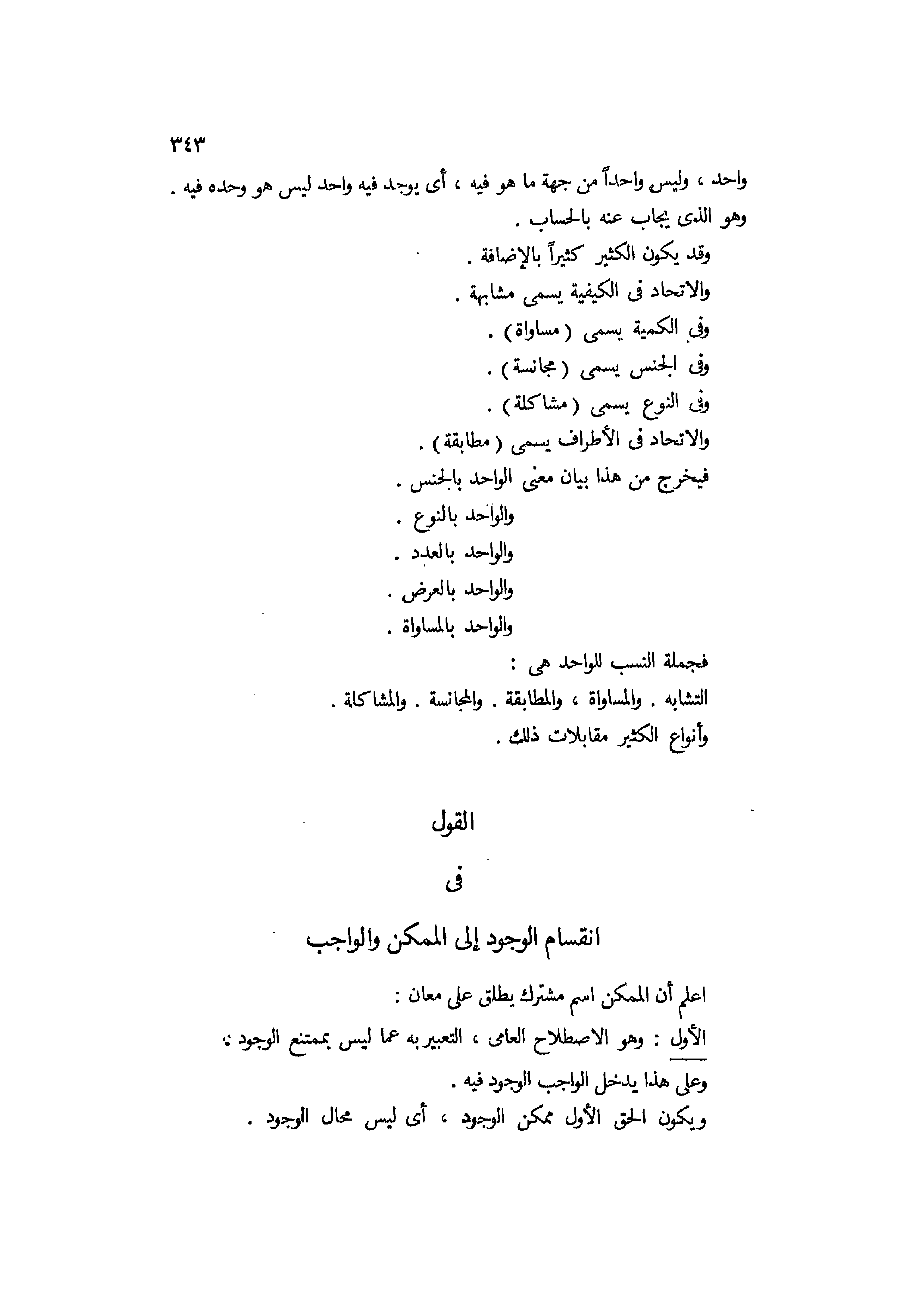 اعلم أن الممكن إسم مشترك يطلق على معان: الأول وهو الإصلاح العامي التعبير به عما ليس بممتنع الوجودن وعلى هذا يدخل الواجب الوجود فيه، ويكون الأول الحق ممكن الوجود، أي ليس محال الوجود،