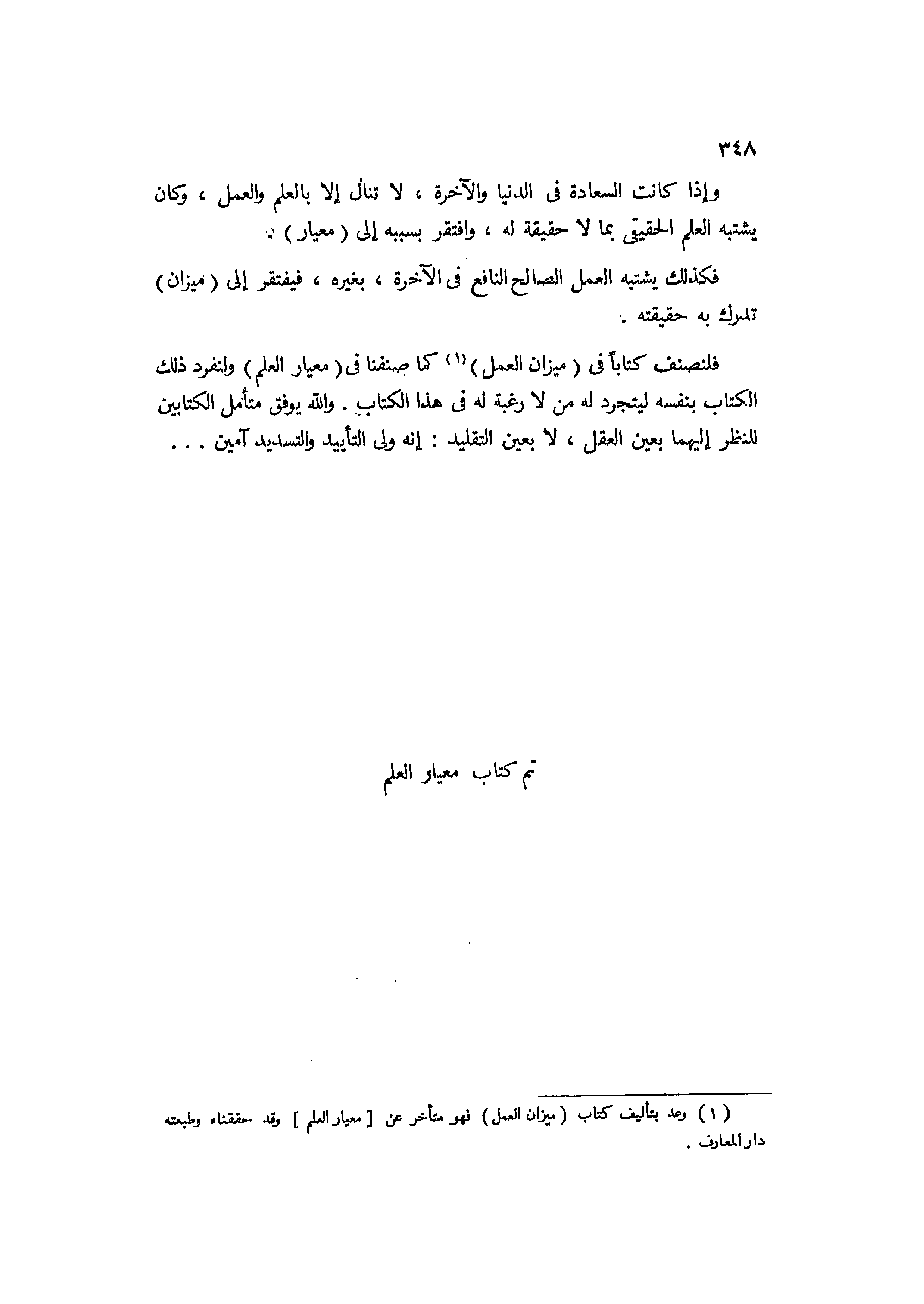 فلنصنف كتابا في ميوان العمل كما صنفناه في معيارالعلم، ولنفرد ذلك الكتاب بنفسه ليتجرد لهمن لا رغبة له في هذا الكتاب. والله يوفق متأمل الكتابين للنظر إليهما بعين العقل لا بعين التقليد، إنه ولي التأييد والتسديد.