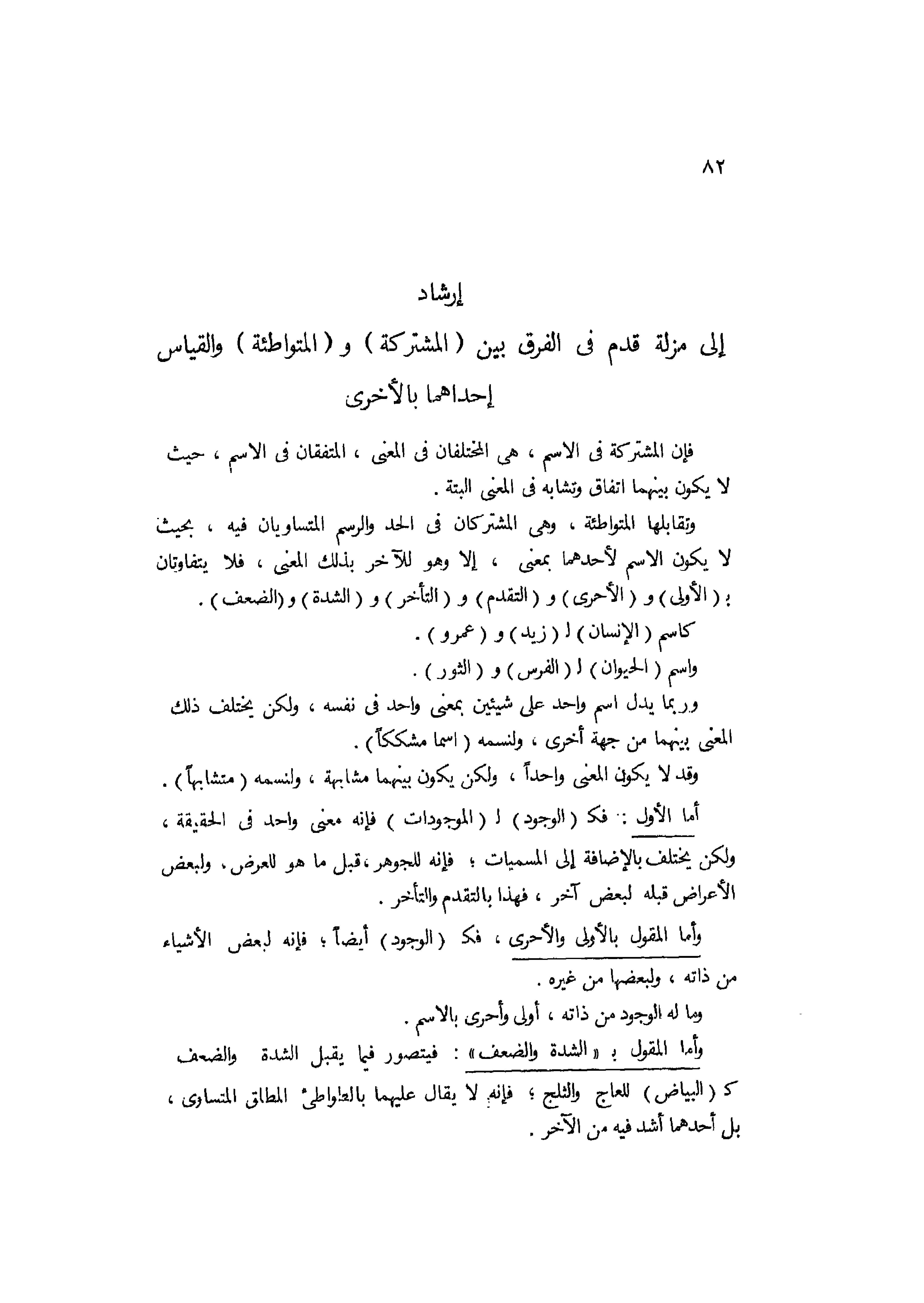 أما الأول فالكالوجود للموجودات؛ فإنه معنى واحد في الحقيقة ولكن يختلف بالإضافة إلى المسميات، فإنه للجوهر قبل ما هو للعرض ولبعض الأعراض قبله لبعض آخر، فهذا بالتقدم والتأخر. وأما المقول بالأولى والأحرى فالكالوجود أيضا فإنه لبعض الأشياء من ذاته ولبعضها من غره، وما له الوجود من ذاته أولى وأحرى بالإسم، واما المقول بالشدة والضعف فيتصور فيما يقبل الشدة والضعف كالبياض للعاج والثلج، فإنه لا يقال عليهما بالتواطؤ المطلق المتساوي بل أحدهما أشد فيه من الآخر.