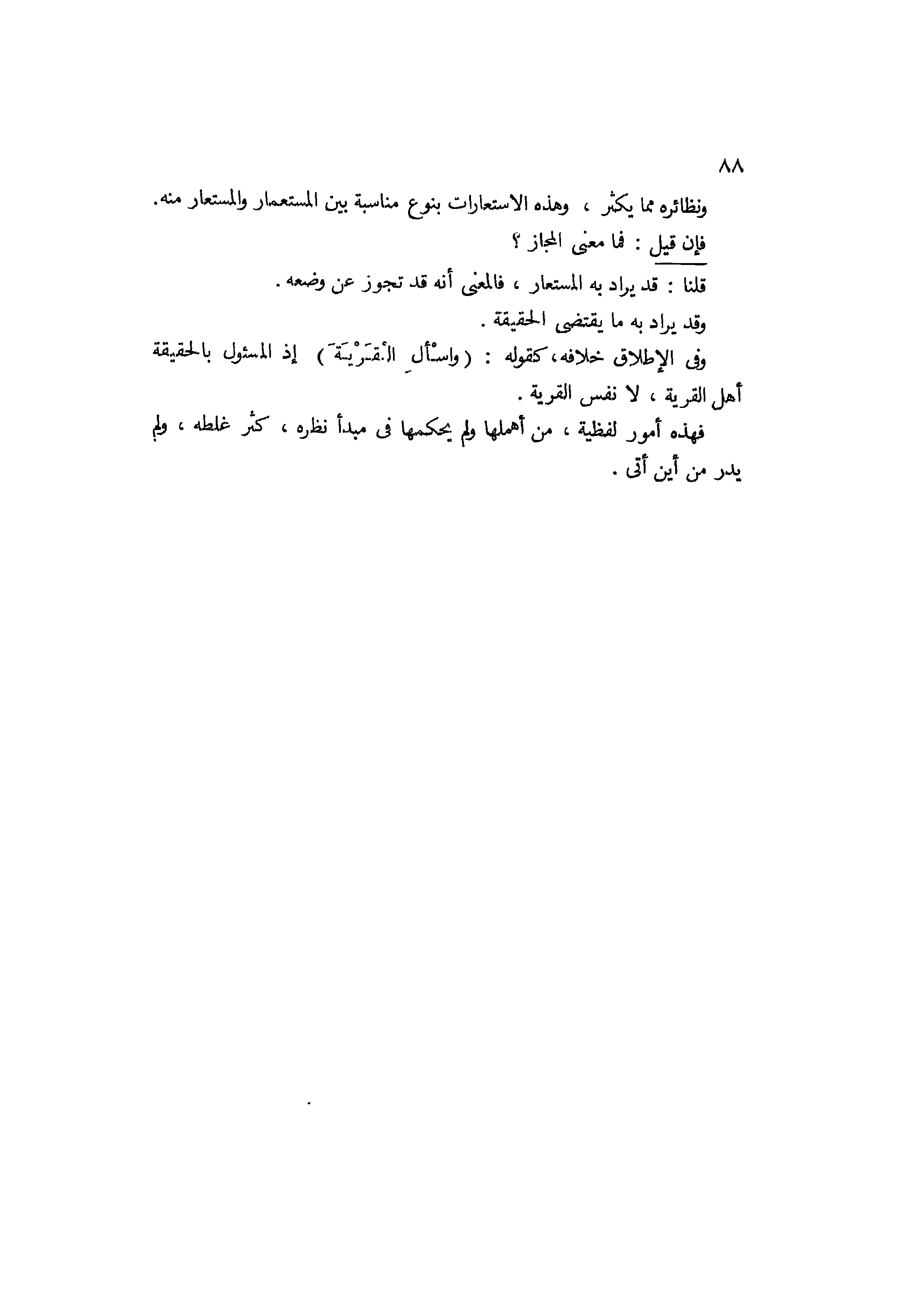 فإن قيل: فما معنى المجاز؟ قلنا قد يراد به المستعار فالمعنى أنه قد تجوز عن وضعه، وقد يراد به ما يقتضي الحقيقة، وفي الإطلاق خلافه كقوله: (وأسأل القرية) إذ المسؤول بالحقيقة أهل القرية لا نفس القرية؛ فهذه أمور لفظية من أهملها ولم يحكمها في مبدأ نظره كثر غلطه ولم يدر من أين أتى.