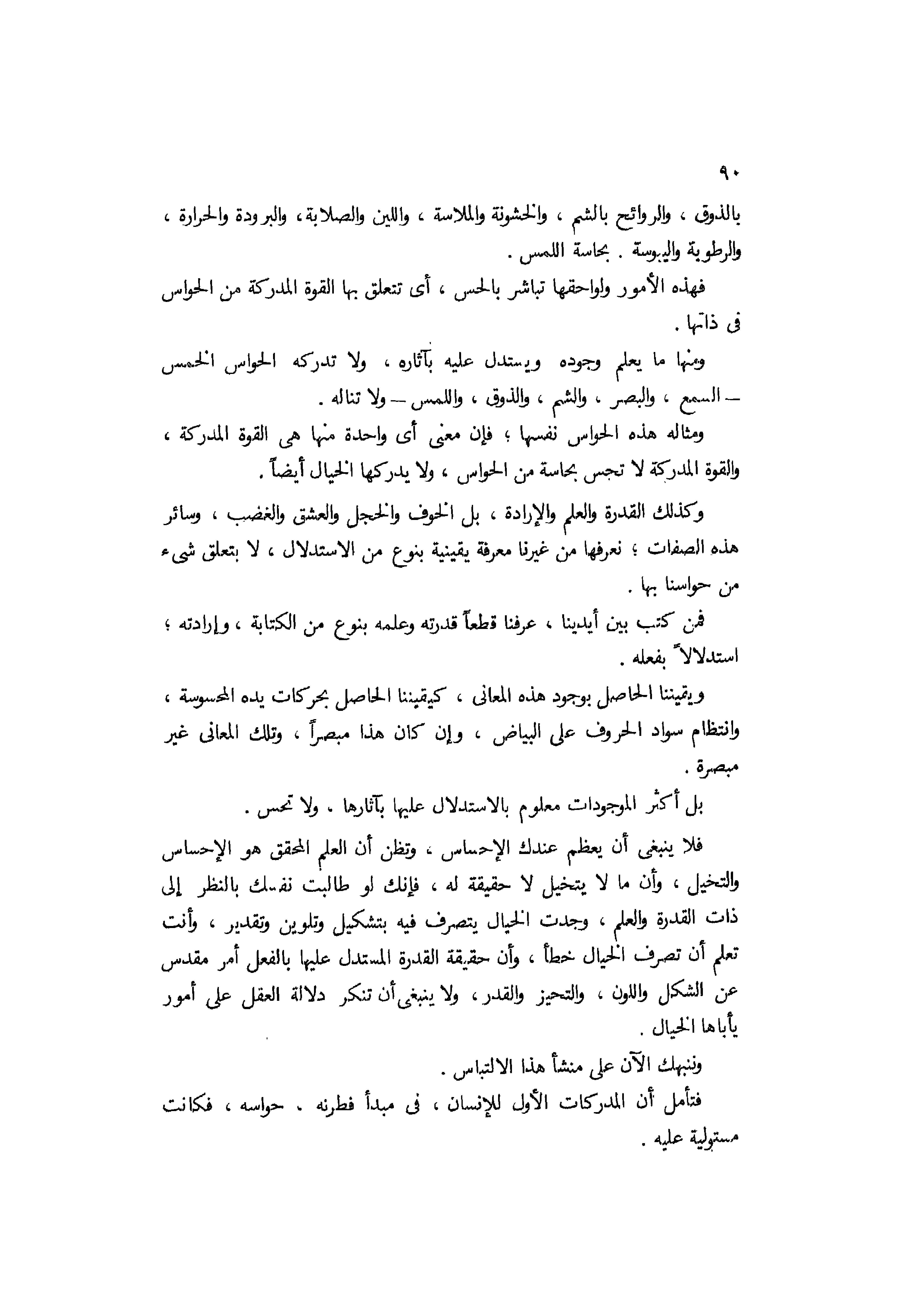 وننبهك الآن على منشأ هذا الإلتباس؛ فتأمل أن المدركات الأول للإنسان في مبدأ فطرته حواسه فكانت مستولية عليه،