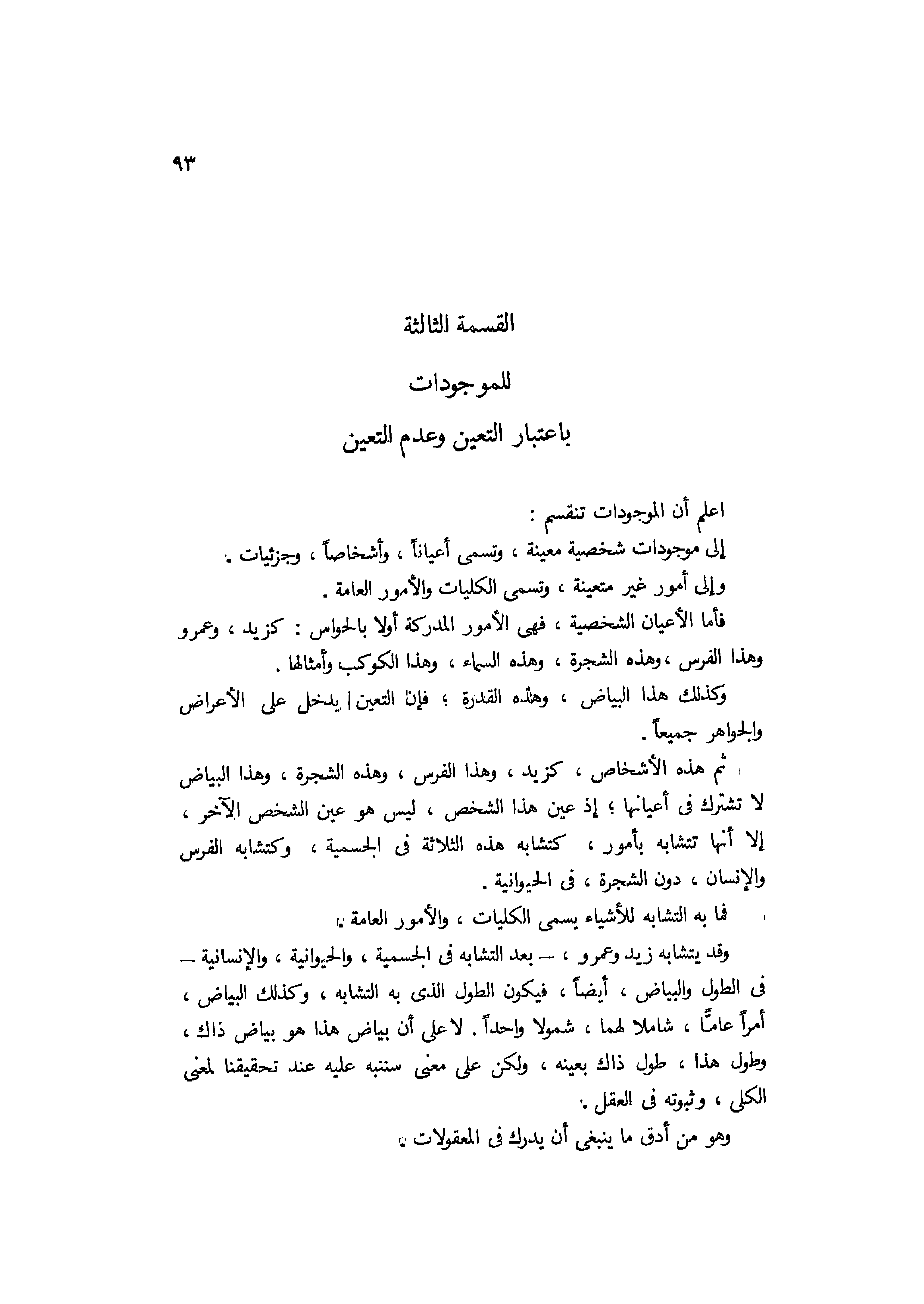 إعلم أن الموجودات تنقسم إلى موجودات شخصية معينة وتسمى أعيانا وأشخاصا وجزئيات، وإلى أمور غير متعينة وتسمى الكليات والأمور العامة. فأما الأعيان الشخصية فهي الأمور المدركة أولا بالحواس كزيد وعمرون وهذا الفرس وهذه الشجرة وهذه السماء وهذا الكوكب وأمثالها، وكذا هذا البياض وهذه القدرة، فإن التعين يدخل على الأعراض والجواهر جميعا. ثم هذه الأشخاص كزيد وهذا الفرس وهذه الشجرة وهذا البياض لا تشترك في أعيانها، إذ عين هذا الشخص ليس هو عين الشخص الآخر، إلا أنها تتشابه بأمور كتشابه هذه الثلاثة في الجسمية وتشابه الفرس والإنسان دون الشجر في الحيوانية، فما به التشابه للأشياء يسمة الكليات والأمور العامة، وقد يتشابه زيد وعمرو بعد التشابه في الجسمية والحيوانية والإنسانية في الطول والبياض أيضا، فيكون الطول الذي به التشابه وكذا البياض أمرا عاما شاملا لهما شمولا واحدا، لا على أن بياض هذا هو بياض ذاك وطول هذا طول ذاك بعينه، ولكن على معنى سنبه عليه عند تحقيقنا لمعنى الكلي وثبوته في العقل، وهو من أدق ما ينبغي أن يدرك في المعقولات.