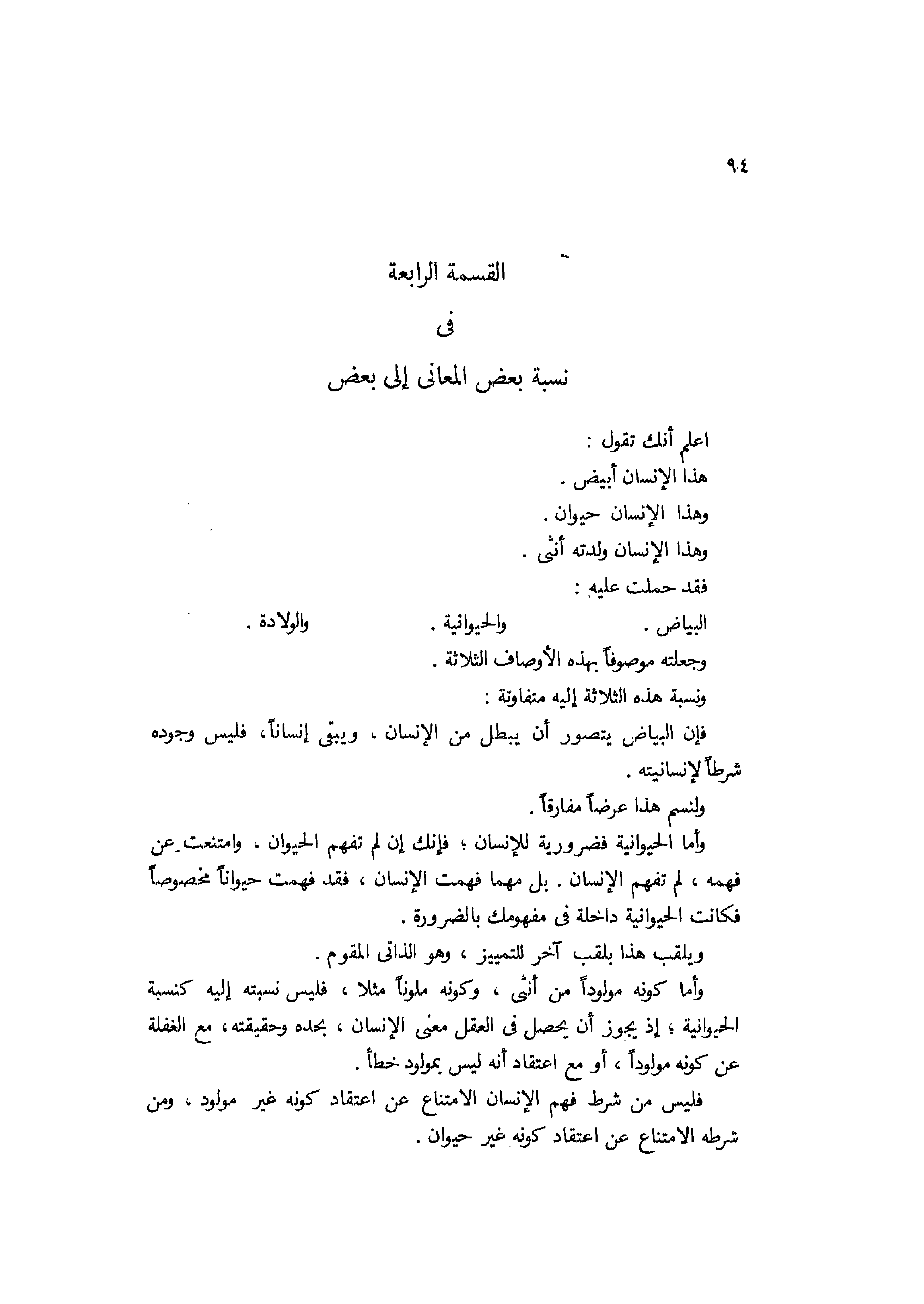 القسمة الرابعة في نسبة بعض المعاني إلى بعض إعلم أنك تقول: هذا الإنسان أبيض وهذا الإنسان حيوان، وهذا الإنسان ولدته أنثى، فقد حملت عليه البياض والحيوانية والولادة وجعلته موصوفا بهذه الأوصاق الثلاثة، ونسبة هذه الثلاثة إليه متفاوتة: فإن البياض يتصور ان يبطل من الإنسان ويبقى إنسانا فليس وجوده شرطا لإنسانيته ولنسم هذا عرضيا مفارقا.