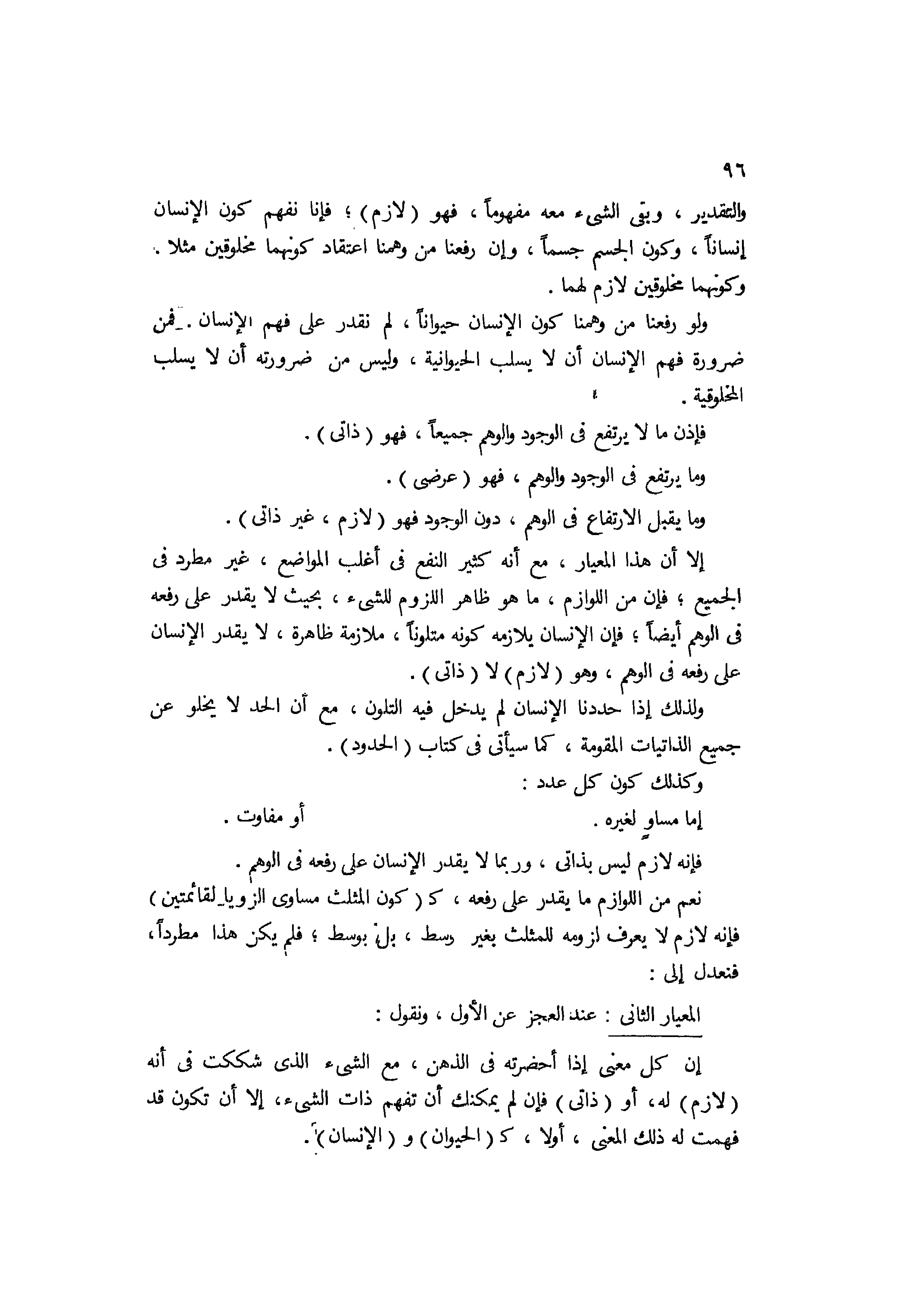 والتقدير وبقي الشيء معه مفهوما فهو لازم، فأنا نفهم كون الإنسان إنسانا وكون الجسم جسما وإن رفعنا من وهمنا كون الإنسان إنسانا وكون الجسم جسما وإن رفعنا من وهمنا اعتقاد كونهما مخلوقين مثلا وكونهما مخلوقين لازم لهما، ولو رفعنا من وهمنا كون الإنسان حيوانا لم نقدر على فهم الإنسان.