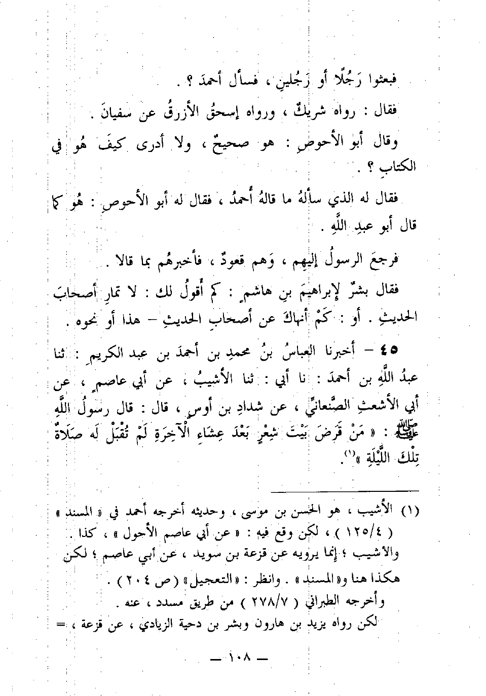 45 - أخبرنا العباسُ بنُ محمدِ بْنِ أحمدَ بْنِ عَبْدِ الْكَرِيمِ: ثنا عَبْدُ اللَّهِ بْنُ أَحْمَدَ: نا أَبِي: ثنا الأَشْيَبُ، عَنْ أَبِي عَاصِمٍ، عَنْ أَبِي الأَشْعَثِ الصَّنْعَانِيِّ، عَنْ شَدَّادِ بْنِ أَوْسٍ، قَالَ: قَالَ رَسُولُ اللَّهِ (صَلَّى اللَّهُ عَلَيْهِ وَسَلَّمَ): "مَنْ قَرَضَ بَيْتَ شعرٍ بَعْدَ عِشَاءِ الآخرة لم تقبل لَهُ صَلاةٌ تِلْكَ اللَّيْلَةَ".