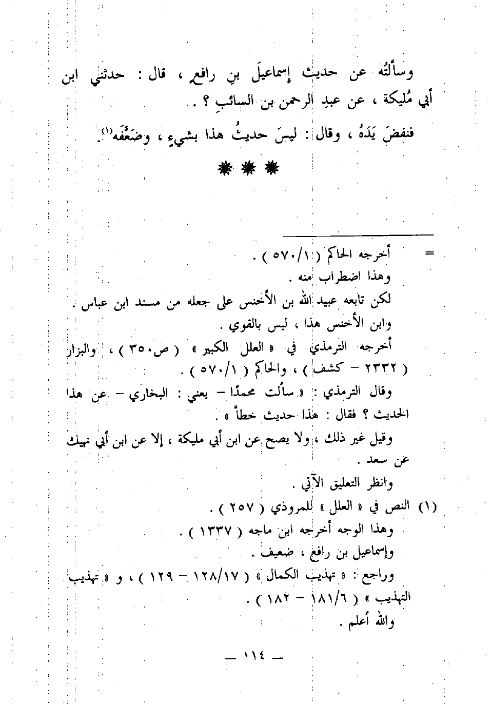 وَسَأَلْتُه عَنْ حَدِيثِ إِسْمَاعِيلَ بْنِ رَافِعٍ، قَالَ: حَدَّثَنِي ابْنُ أَبِي مُلَيْكَةَ، عَنْ عَبْدِ الرَّحْمَنِ بْنِ السَّائِبِ؟.