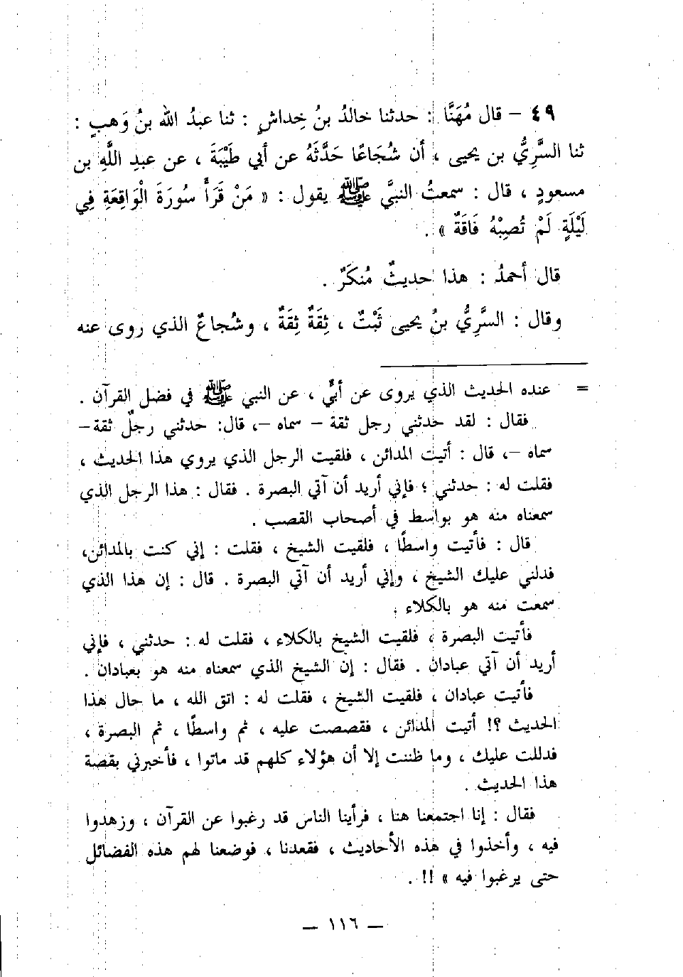 49 - قال مهنَّا: حَدَّثَنَا خَالِدُ بْنُ خِدَاشٍ: ثنا عَبْدُ اللَّهِ بْنُ وَهْبٍ: ثنا السَّرِيُّ بْنُ يَحْيَى، أَنَّ شُجَاعًا حَدَّثَهُ عَنْ أَبِي طَيْبَةَ، عَنْ عَبْدِ اللَّهِ بْنِ مَسْعُودٍ، قَالَ: سَمِعْتُ النَّبِيَّ (صَلَّى اللَّهُ عَلَيْهِ وَسَلَّمَ) يَقُولُ: "مَنْ قَرَأَ سُورَةَ الواقعة في ليلة لم تصيبه فَاقَةٌ".