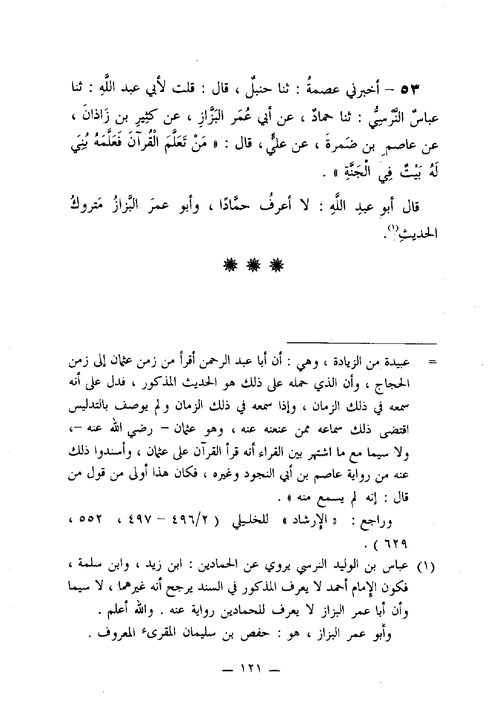53 - أخبرني عِصْمَةُ: ثنا حَنْبَلٌ، قَالَ: قُلْتُ لأَبِي عَبْدِ اللَّهِ: ثنا عَبَّاسٌ النَّرْسِيُّ: ثنا حَمَّادٌ، عَنْ أَبِي عُمَرَ الْبَزَّازِ، عَنْ كَثِيرِ بْنِ زَاذَانَ، عَنْ عَاصِمِ بْنِ ضَمْرَةَ، عَنْ عَلِيٍّ، قَالَ: "مَنْ تَعَلَّمَ الْقُرْآنَ فَعَلَّمَهُ بُنِيَ لَهُ بَيْتٌ فِي الْجَنَّةِ".