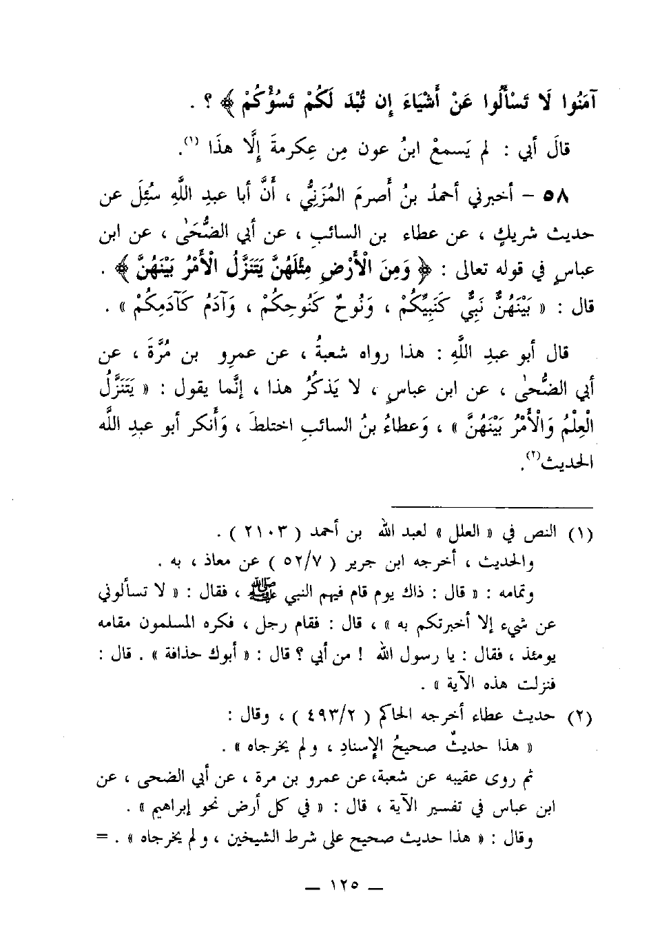 58 - أخبرني أَحْمَدُ بْنُ أَصْرَمَ الْمُزَنِيُّ، أَنَّ أَبَا عَبْدِ اللَّهِ سُئِلَ عَنْ حَدِيثِ شَرِيكٍ، عَنْ عَطَاءِ بْنِ السَّائِبِ، عَنْ أَبِي الضُّحَى، عَنِ ابْنِ عَبَّاسٍ فِي قَوْلِهِ تَعَالَى: {وَمِنَ الأَرْضِ مِثْلَهُنَّ يتنزل الأمر بينهن}.