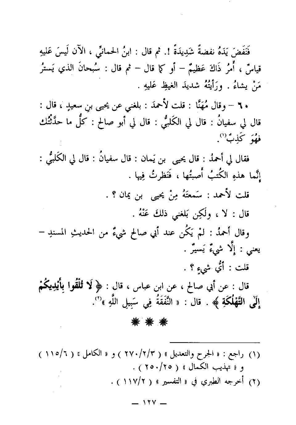 فَقَالَ لِي أَحْمَدُ: قَالَ يَحْيَى بْنُ يَمَانٍ: قَالَ سُفْيَانُ: قَالَ لِي الْكَلْبِيُّ: إِنَّمَا هَذِهِ الْكُتُبُ أَصَبْتُهَا، فَنَظَرْتُ فِيهَا.