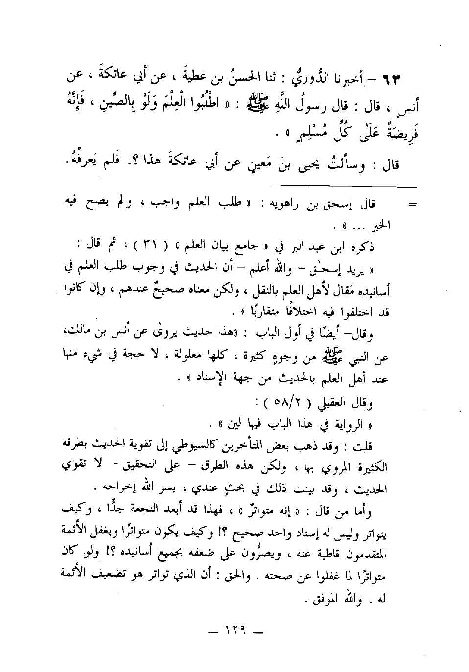 63 - أخبرنا الدُّورِيُّ: ثنا الْحَسَنُ بْنُ عَطِيَّةَ، عَنْ أَبِي عَاتِكَةَ، عَنْ أَنَسٍ، قَالَ: قَالَ رَسُولُ اللَّهِ (صَلَّى اللَّهُ عَلَيْهِ وَسَلَّمَ): "اطْلُبُوا الْعِلْمَ وَلَوْ بِالصِّينِ، فَإِنَّهُ فَرِيضَةٌ عَلَى كُلِّ مُسْلِمٍ".
