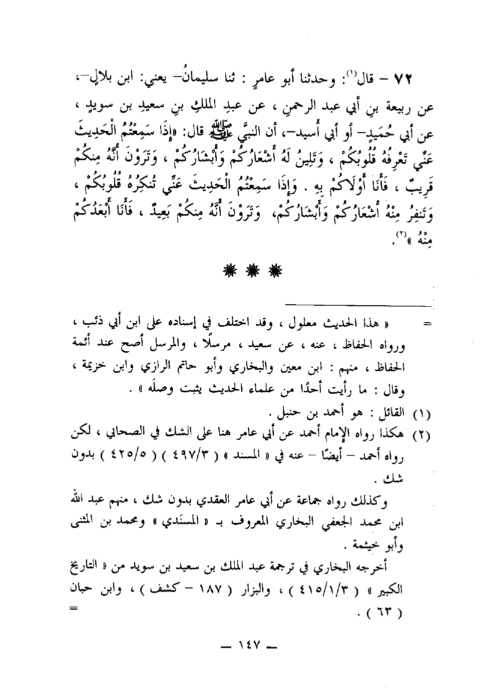 72 - قال: وَحَدَّثَنَا أَبُو عَامِرٍ: ثنا سُلَيْمَانُ- يَعْنِي: ابْنَ بِلالٍ-، عَنْ رَبِيعَةَ بْنِ أَبِي عَبْدِ الرَّحْمَنِ، عَنْ عَبْدِ الْمَلِكِ بْنِ سَعِيدِ بْنِ سُوَيْدٍ، عَنْ أَبِي حُمَيْدٍ -أَوْ أَبِي أَسيد-، أَنّ النَّبِيَّ (صَلَّى اللَّهُ عَلَيْهِ وَسَلَّمَ) قَالَ: "إِذَا سَمِعْتُمُ الْحَدِيثَ عَنِّي تَعْرِفُهُ قُلُوبُكُمْ، وَتَلِينُ لَهُ أَشْعَارُكُمْ وَأَبْشَارُكُمْ، وَتَرَوْنَ أَنَّهُ مِنْكُمْ قَرِيبٌ، فَأَنَا أَوْلاكُمْ بِهِ. وَإِذَا سَمِعْتُمُ الْحَدِيثَ عَنِّي تُنْكِرُهُ قُلُوبُكُمْ، وَتَنْفِرُ مِنْهُ أَشْعَارُكُمْ وَأَبْشَارُكُمْ، وَتَرَوْنَ أَنَّهُ منكم بعيد، فأنا أبعدكم منه".