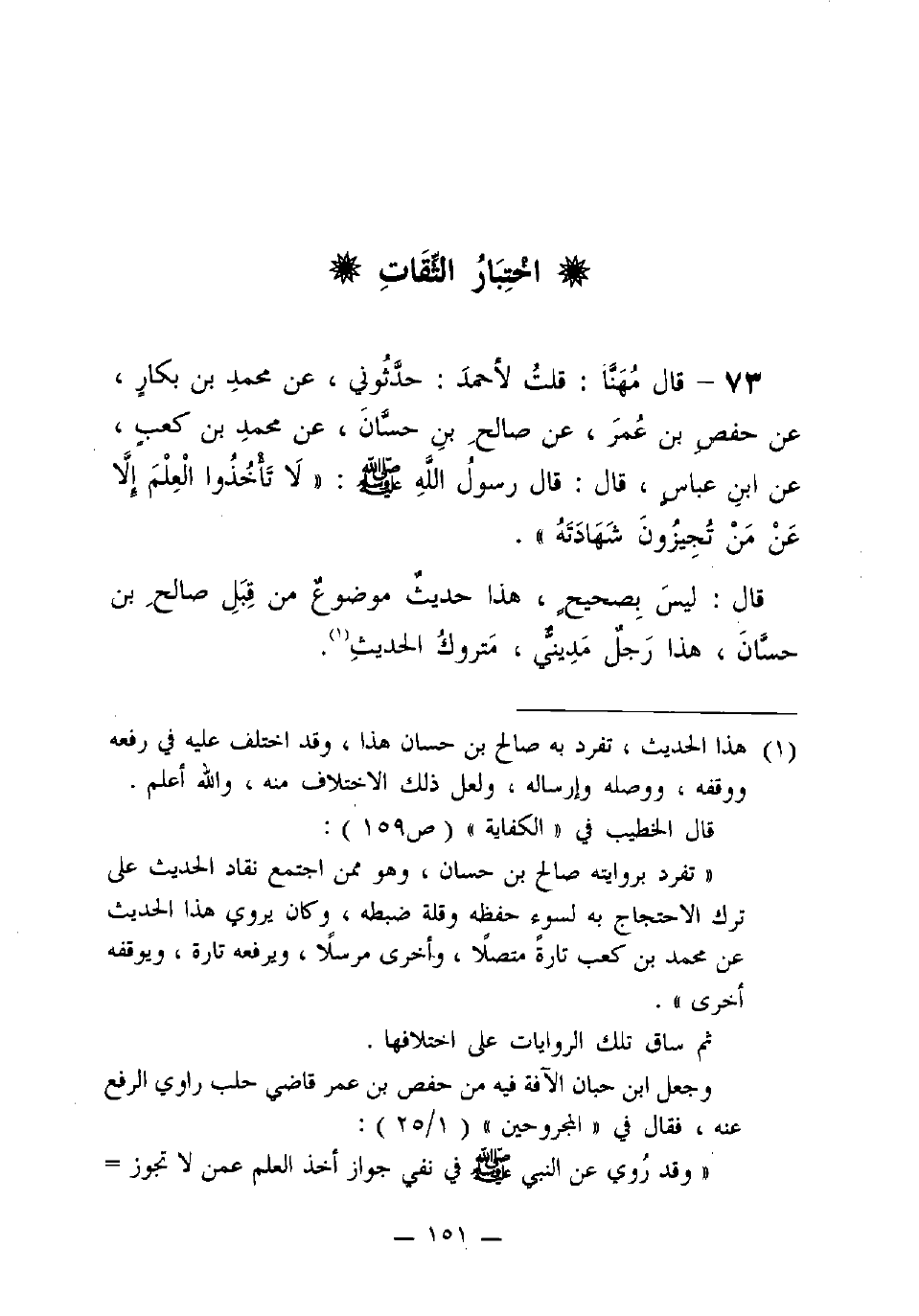 73 - قال مهنّا: قُلْتُ لأَحْمَدَ: حدِّثوني، عَنْ مُحَمَّدِ بْنِ بَكَّارٍ، عَنْ حَفْصِ بْنِ عُمَرَ، عَنْ صَالِحِ بْنِ حَسَّانٍ، عَنْ مُحَمَّدِ بْنِ كَعْبٍ، عَنِ ابْنِ عَبَّاسٍ، قَالَ: قَالَ رَسُولُ اللَّهِ (صَلَّى اللَّهُ عَلَيْهِ وَسَلَّمَ): "لا تَأْخُذُوا الْعِلْمَ إِلا عَنْ من تجيزون شهادته".