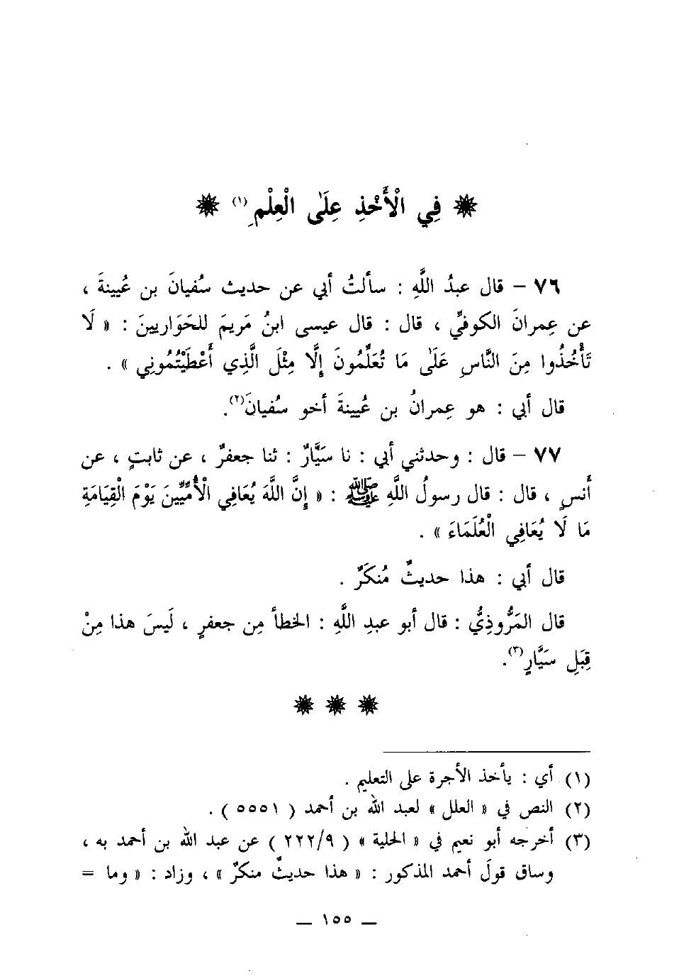 76 - قال عَبْدُ اللَّهِ: سَأَلْتُ أَبِي عَنْ حَدِيثِ سُفْيَانَ بْنِ عُيَيْنَةَ، عَنْ عِمْرَانَ الْكُوفِيِّ، قَالَ: قَالَ عيسى ابن مَرْيَمَ لِلْحَوَارِيِّينَ: "لا تَأْخُذُوا مِنَ النَّاسِ عَلَى مَا تَعْلَمُونَ إِلا مِثْلَ الَّذِي أَعْطَيْتُمُونِي".