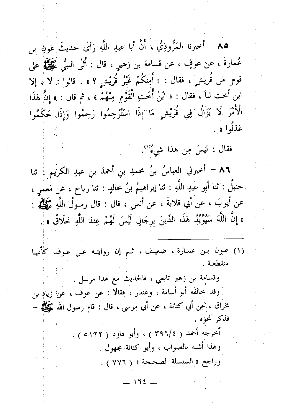 85 - أخبرنا المرُّوذي، أَنَّ أَبَا عَبْدِ اللَّهِ رَأَى حَدِيثَ عَوْنِ بْنِ عُمَارَةَ، عَنْ عَوْفٍ، عَنْ قَسَامَةَ بْنِ زُهَيْرٍ، قَالَ: أَتَى النَّبِيُّ (صَلَّى اللَّهُ عَلَيْهِ وَسَلَّمَ) عَلَى قَوْمٍ مِنْ قُرَيْشٍ، فَقَالَ: "أمِنكُمْ غَيْرُ قُرَيْشٍ؟ ". قَالُوا: لا، إِلا ابْنَ أُخْتٍ لَنَا، فَقَالَ: "ابْنُ أُختِ الْقَوْمِ مِنْهُمْ"، ثُمَّ قَالَ: "إِنَّ هَذَا الأَمْرَ لا يَزَالُ فِي قُرَيْشٍ مَا إِذَا اسْتُرْحِمُوا رَحِمُوا وَإِذَا حَكَمُوا عَدَلُوا".