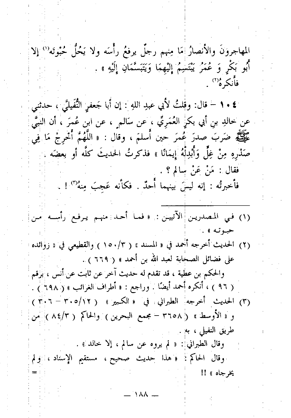 104 - قَالَ: وَقُلْتُ لأَبِي عَبْدِ اللَّهِ: إِنَّ أَبَا جَعْفَرٍ النُّفيليّ، حَدَّثَنِي عَنْ خَالِدِ بْنِ أَبِي بَكْرٍ الْعُمَرِيِّ، عَنْ سَالِمٍ، عَنِ ابْنِ عُمَرَ، أَنَّ النَّبِيَّ (صَلَّى اللَّهُ عَلَيْهِ وَسَلَّمَ) ضَرَبَ صَدْرَ عُمَرَ حِينَ أَسْلَمَ، وَقَالَ: "اللَّهُمَّ أَخْرِجْ مَا فِي صَدْرِهِ مِنْ غلٍّ وَأَبْدِلْهُ إِيمَانًا" فَذَكَرْتُ الْحَدِيثَ كُلَّهُ أَوْ بَعْضَهُ.
