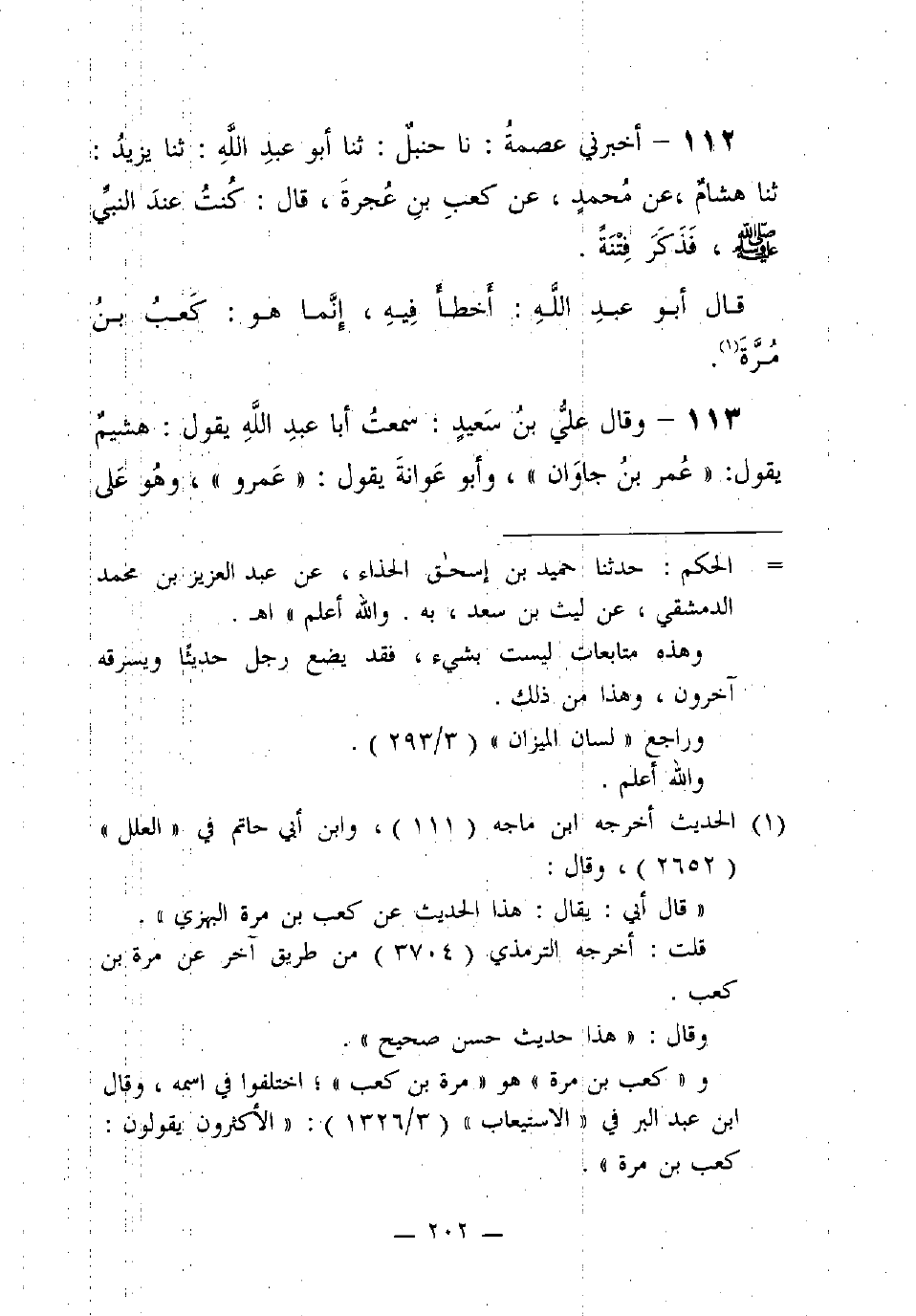112 - أخبرني عِصْمَةُ: نا حَنْبَلٌ: ثنا أَبُو عَبْدِ اللَّهِ: ثنا يَزِيدُ: ثنا هِشَامٌ، عَنْ مُحَمَّدٍ، عَنْ كَعْبِ بْنِ عُجْرَةَ، قَالَ: كُنْتُ عِنْدَ النَّبِيِّ (صَلَّى اللَّهُ عَلَيْهِ وَسَلَّمَ)، فَذَكَرَ فِتْنَةً.