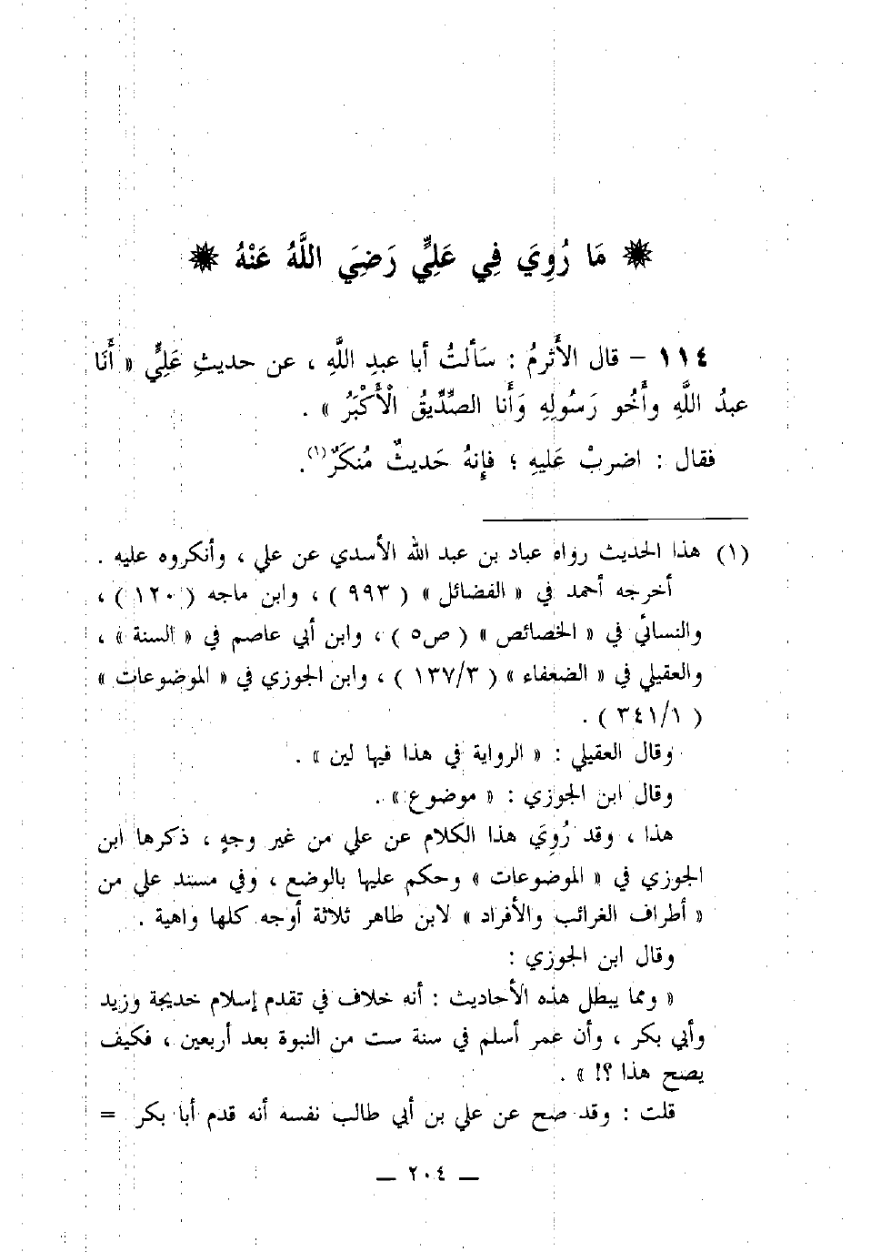 114 - قال الأَثْرَمُ: سَأَلْتُ أَبَا عَبْدِ اللَّهِ، عَنْ حَدِيثِ عَلِيٍّ "أَنَا عَبْدُ اللَّهِ وَأَخُو رَسُولِهِ وَأَنَا الصِّدِّيقُ الأَكْبَرُ"