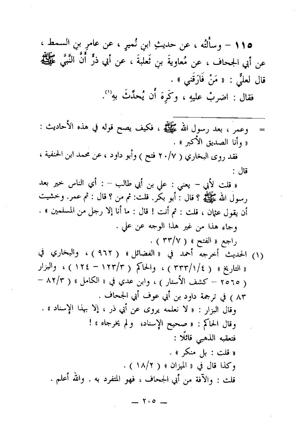 115 - وَسَأَلْتُهُ، عَنْ حَدِيثِ ابْنِ نميرٍ، عَنْ عَامِرِ بْنِ السِّمْطِ، عَنْ أَبِي الْجَحَّافِ، عَنْ مُعَاوِيَةَ بْنِ ثَعْلَبَةَ، عَنْ أَبِي ذرٍّ أَنَّ النَّبِيَّ (صَلَّى اللَّهُ عَلَيْهِ وَسَلَّمَ) قَالَ لِعَلِيٍّ: "مَنْ فَارَقَنِي".