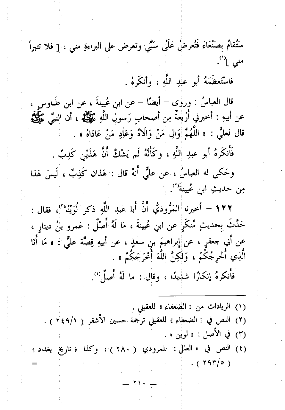 122 - أخبرنا المروذي أن أبا عبد الله ذكر لُوَيْناً، فَقَالَ: حَدَّثَ بِحَدِيثٍ مُنْكَرٍ عَنِ ابْنِ عُيَيْنَةَ، مَا لَهُ أَصْلٌ