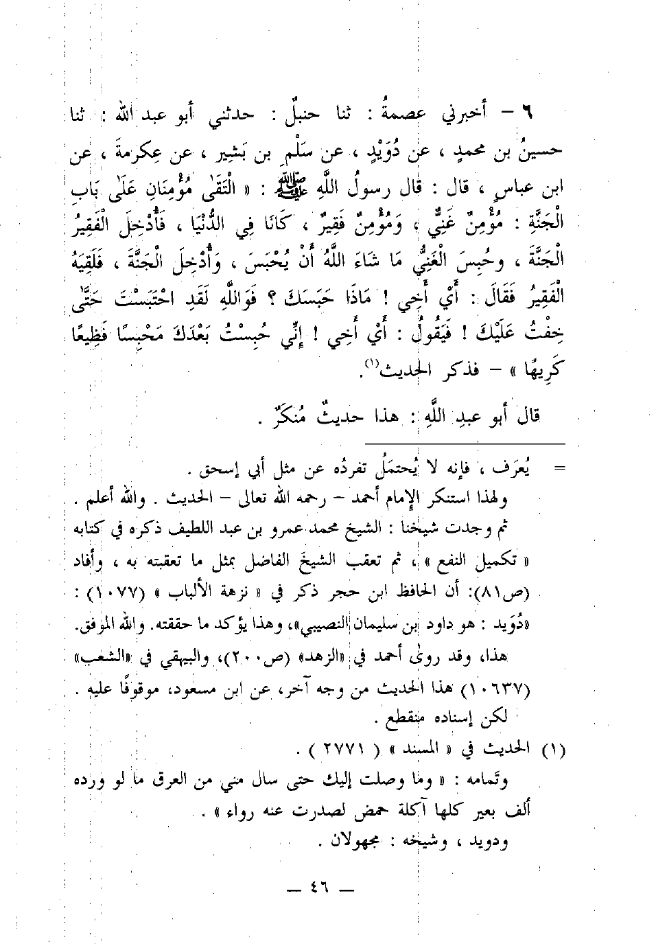 6 - أخبرني عصمة: ثنا أَبُو عَبْدِ اللَّهِ: ثنا حُسَيْنُ بْنُ مُحَمَّدٍ، عْنَ دُوَيْدٍ، عَنْ سَلْمِ بْنِ بَشِيرٍ، عَنْ عِكْرِمَةَ، عَنِ ابْنِ عَبَّاسٍ، قَالَ: قَالَ رَسُولُ اللَّهِ (صَلَّى اللَّهُ عَلَيْهِ وَسَلَّمَ): "الْتَقَى مُؤْمِنَانِ عَلَى بَابِ الْجَنَّةِ: مُؤْمِنٌ غَنِيٌّ، وَمُؤْمِنٌ فَقِيرٌ، كَانَا فِي الدُّنْيَا، فَأُدْخِلَ الْفَقِيرُ الْجَنَّةَ، وَحُبِسَ الغني ما شاء الله أن يحبس، وأدخل الْجَنَّةَ، فَلَقِيَهُ الْفَقِيرُ فَقَالَ: أَيْ أَخِي! مَاذَا حَبَسَكَ؟ فَوَاللَّهِ لَقَدِ احتبستَ حَتَّى خِفْتُ عَلَيْكَ! فَيَقُولُ: أَيْ أَخِي! إِنِّي حُبِسْتُ بَعْدَكَ مَحْبَسًا فَظِيعًا كَرِيهًا" - فَذَكَرَ الْحَدِيثَ.