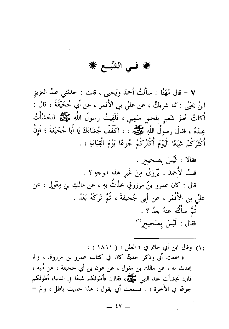 7 - قال مهنّا: سَأَلْتُ أَحْمَدَ وَيَحْيَى، قُلْتُ: حَدَّثَنِي عَبْدُ الْعَزِيزِ ابن يَحْيَى: ثنا شَرِيكٌ عَنْ عَلِيِّ بْنِ الأَقْمَرِ، عَنْ أَبِي جُحَيْفَةَ، قَالَ: أَكَلْتُ خُبْزَ شَعِيرٍ بلحمٍ سمينٍ، فلقيت رَسُولَ اللَّهِ (صَلَّى اللَّهُ عَلَيْهِ وَسَلَّمَ) فَتَجَشَّأْتُ عِنْدَهُ، فَقَالَ رَسُولُ اللَّهِ (صَلَّى اللَّهُ عَلَيْهِ وَسَلَّمَ): "اكْفُفْ جُشَاءَكَ يَا أَبَا جُحَيْفَةَ؛ فَإِنَّ أَكْثَرَكُمْ شَبَعًا الْيَوْمَ أَكْثَرُكُمْ جُوعًا يَوْمَ الْقِيَامَةِ".