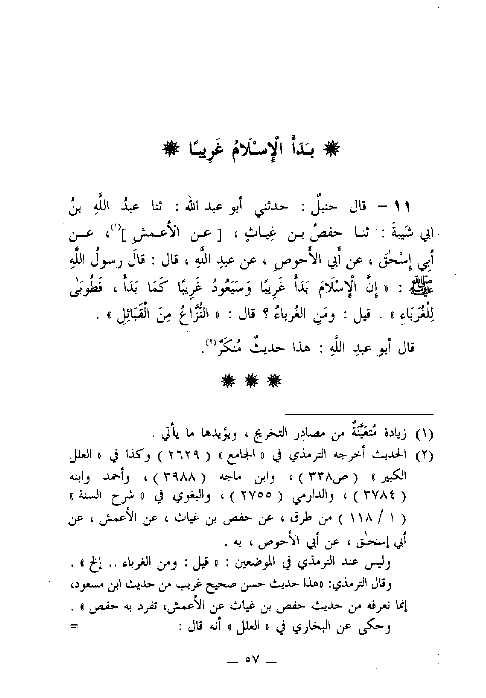 11 - قال حنبل: حدثني أبو عبد الله: ثنا عَبْدُ اللَّهِ بْنُ أَبِي شَيْبَةَ: ثنا حَفْصُ بن غياث، [عن الأعمش]، عَنْ أَبِي إِسْحَاقَ، عَنْ أَبِي الأَحْوَصِ، عَنْ عَبْدِ اللَّهِ، قَالَ: قَالَ رَسُولُ اللَّهِ (صَلَّى اللَّهُ عَلَيْهِ وَسَلَّمَ): "إِنَّ الإِسْلامَ بَدَأَ غَرِيبًا وسيعود غريباً كَمَا بَدَأَ، فَطُوبَى لِلْغُرَبَاءِ". قِيلَ: وَمَنِ الْغُرَبَاءُ؟ قَالَ: "النُّزُّاع مِنَ الْقَبَائِلِ".