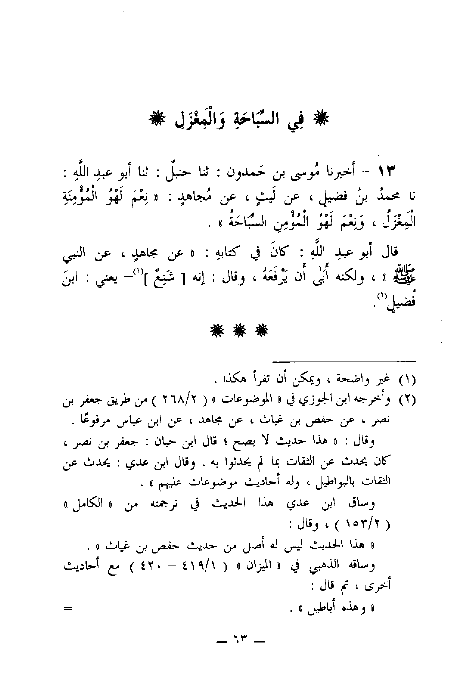 13 - أخبرنا مُوسَى بْنُ حَمْدُونٍ، ثنا حَنْبَلٌ: ثنا أَبُو عَبْدِ اللَّهِ: نا مُحَمَّدُ بْنُ فُضَيْلٍ، عَنْ لَيْثٍ، عَنْ مُجَاهِدٍ: "نِعْمَ لَهْوُ الْمُؤْمِنَةِ الْمِغْزَلُ، وَنِعْمَ لَهْوَ الْمُؤْمِنِ السِّبَاحَةُ".