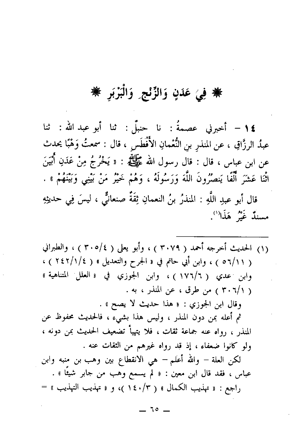 14 - أخبرني عِصْمَةُ: نا حَنْبَلٌ: ثنا أَبُو عَبْدِ اللَّهِ: ثنا عَبْدُ الرَّزَّاقِ، عَنِ الْمُنْذِرِ بْنِ النُّعْمَانِ الأَفْطَسِ، قَالَ: سَمِعْتُ وَهْبًا يُحَدِّثُ عَنِ ابْنِ عَبَّاسٍ، قَالَ: قَالَ رَسُولُ اللَّهِ (صَلَّى اللَّهُ عليه وسلم): "يَخْرُجُ مِنْ عَدَنِ أَبْيَنَ اثْنَا عَشَرَ أَلْفًا يَنْصُرُونَ اللَّهَ وَرَسُولَهُ، وَهُمْ خَيْرُ مَنْ بَيْنِي وَبَيْنَهُمْ".