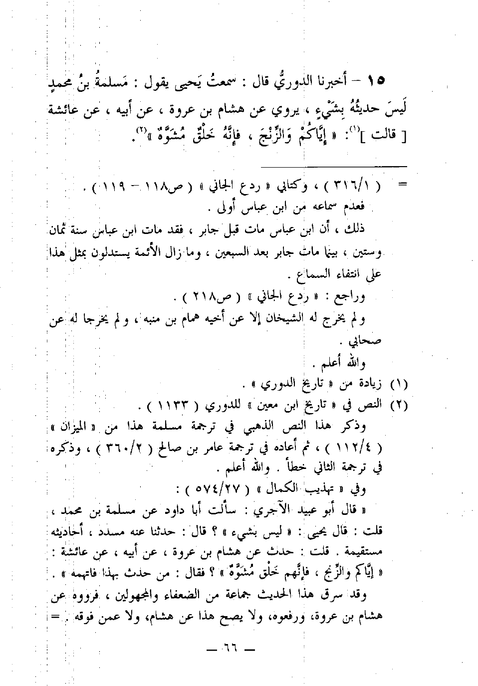 15 - أخبرنا الدوري قَالَ: سَمِعْتُ يَحْيَى يَقُولُ: مَسْلَمَةُ بْنُ مُحَمَّدٍ لَيْسَ حَدِيثُهُ بِشَيْءٍ، يَرْوِي عَنْ هِشَامِ بْنِ عروة، عن أبيه، عن عائشة [قالت]: "إياكم والزنج، فإنه خلق مشوه".
