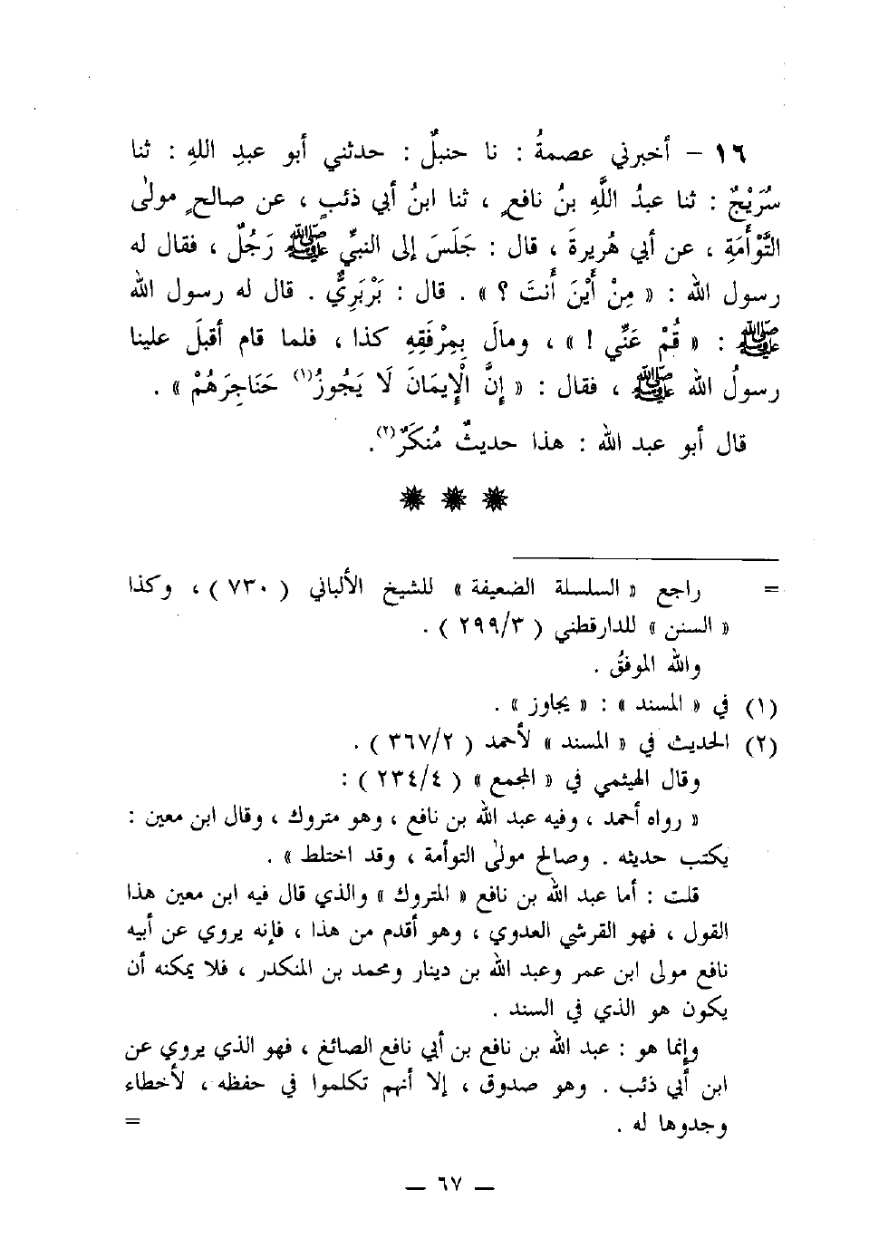 16 - أخبرني عِصْمَةُ: نا حَنْبَلٌ: حَدَّثَنِي أَبُو عَبْدِ اللَّهِ: ثنا سُرَيْجٌ: ثنا عَبْدُ اللَّهِ بْنُ نَافِعٍ، ثنا ابْنُ أَبِي ذِئْبٍ، عَنْ صَالِحٍ مَوْلَى التَّوْأَمَةِ، عْنَ أَبِي هُرَيْرَةَ، قَالَ: جَلَسَ إِلَى النَّبِيِّ (صَلَّى اللَّهُ عَلَيْهِ وَسَلَّمَ) رَجُلٌ، فَقَالَ لَهُ رَسُولُ اللَّهِ: "مِنْ أَيْنَ أَنْتَ؟ ". قَالَ: بربري. قاله لَهُ رَسُولُ اللَّهِ (صَلَّى اللَّهُ عَلَيْهِ وَسَلَّمَ): "قم عنّي!، ومال بِمِرْفَقِهِ كَذَا، فَلَمَّا قَامَ أَقْبَلَ عَلَيْنَا رَسُولُ اللَّهِ (صَلَّى اللَّهُ عَلَيْهِ وَسَلَّمَ)، فَقَالَ: "إِنَّ الإيمان لا يجوز حَنَاجِرَهُمْ".
