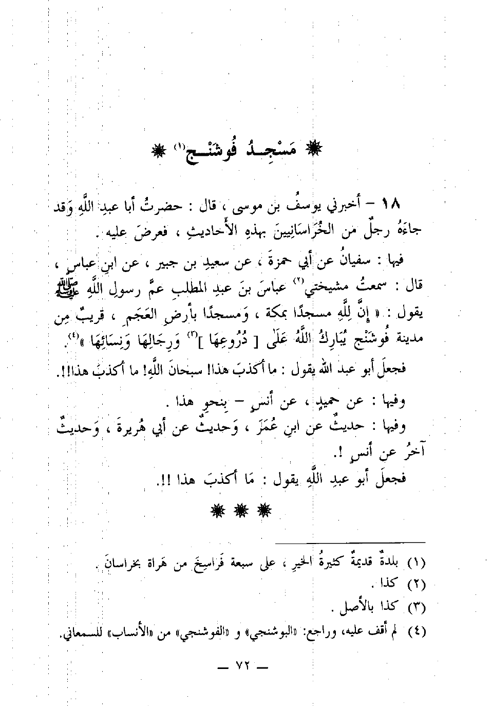 فِيهَا: سُفْيَانُ عَنْ أَبِي حَمْزَةَ، عَنْ سَعِيدِ بْنِ جُبَيْرٍ، عَنِ ابْنِ عَبَّاسٍ، قَالَ: سَمِعْتُ مَشْيَخَتِي عَبَّاسَ بْنَ عَبْدِ الْمُطَّلِبِ عَمَّ رَسُولِ اللَّهِ (صَلَّى اللَّهُ عَلَيْهِ وَسَلَّمَ) يَقُولُ: "إِنَّ لِلَّهِ مَسْجِدًا بِمَكَّةَ، وَمَسْجِدًا بِأَرْضِ الْعَجَمِ، قَرِيبٌ مِنْ مَدِينَةِ فُوشَنْجَ يبارك الله على [دروعها] وراجالها وَنِسَائِهَا".