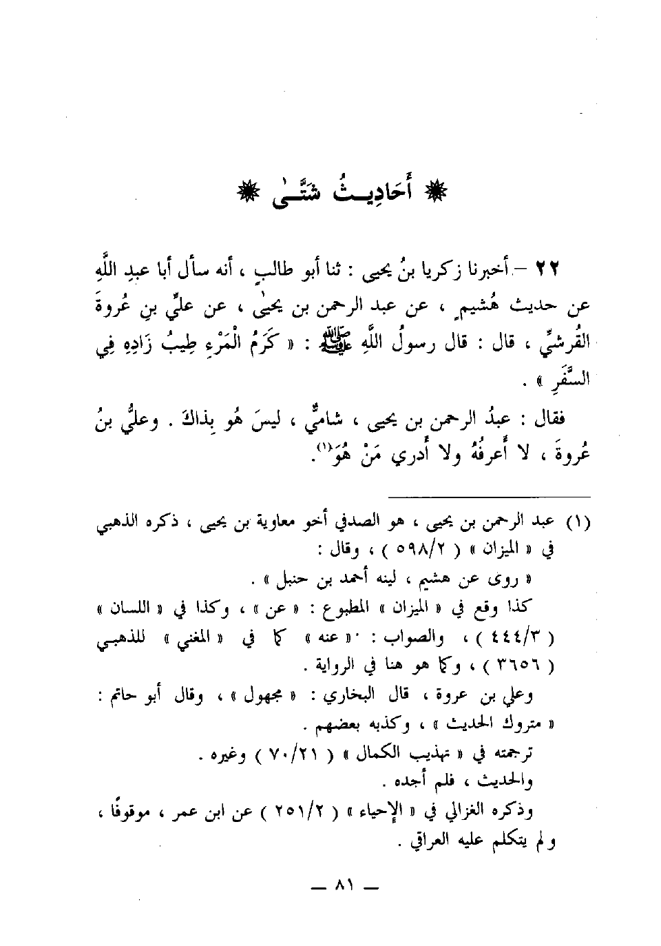 22 - أَخْبَرَنَا زَكَرِيَّا بْنُ يَحْيَى: ثنا أَبُو طالبٍ، أَنَّهُ سَأَلَ أَبَا عَبْدِ اللَّهِ عَنْ حَدِيثِ هشيمٍ، عَنْ عَبْدِ الرَّحْمَنِ بْنِ يَحْيَى، عَنْ عَلِيِّ بْنِ عُرْوَةَ الْقُرَشِيِّ، قَالَ: قَالَ رَسُولُ اللَّهِ (صَلَّى اللَّهُ عَلَيْهِ وَسَلَّمَ): "كَرَمُ الْمَرْءِ طِيبُ زَادِهِ فِي السَّفَرِ".