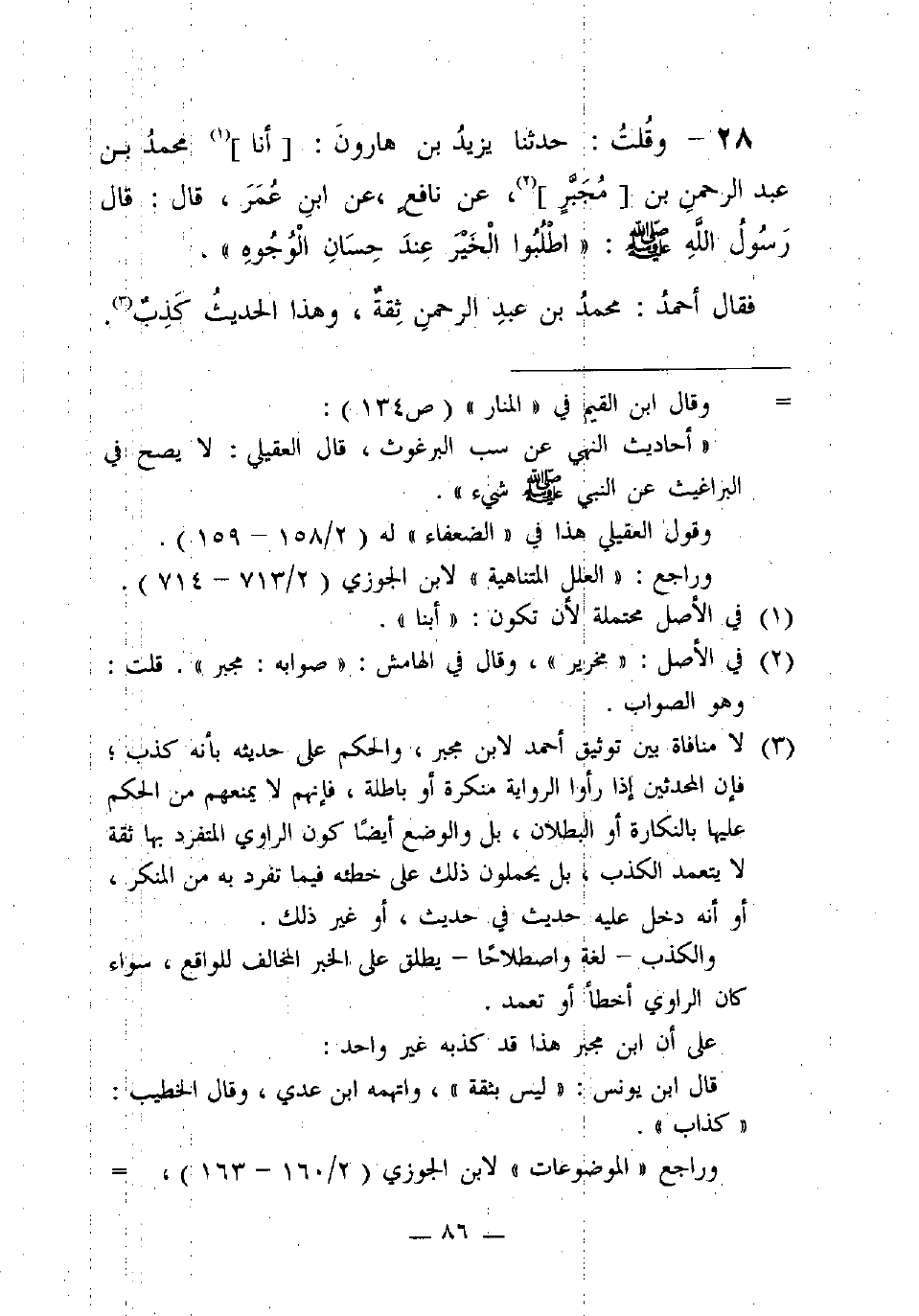 28 - وقلت: حدثنا يزيد بن هارون: [أنا] محمد بن عبد الرحمن بن [مجبِّر]، عَنْ نَافِعٍ، عَنِ ابْنِ عُمَرَ، قَالَ: قَالَ رَسُولُ اللَّهِ (صَلَّى اللَّهُ عَلَيْهِ وَسَلَّمَ): "اطْلُبُوا الْخَيْرَ عِنْدَ حِسَانِ الْوُجُوهِ".