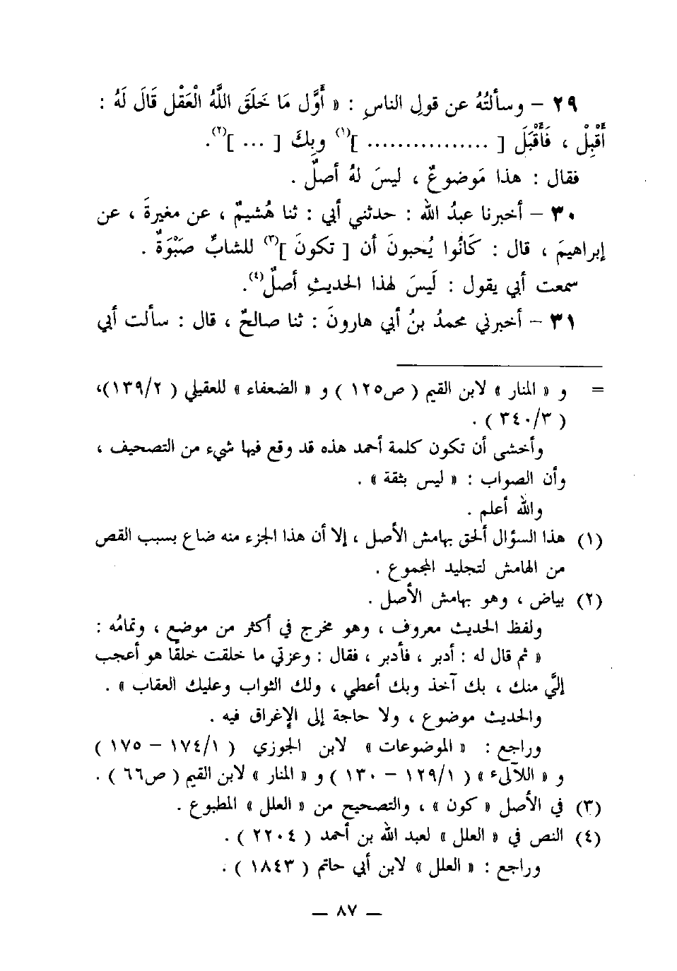 29 - وَسَأَلْتُهُ عَنْ قَوْلِ النَّاسِ: "أَوَّلُ مَا خَلَقَ الله العقل قال له: أقبل، فأقبل [ ........... ] وبك [ ... ].