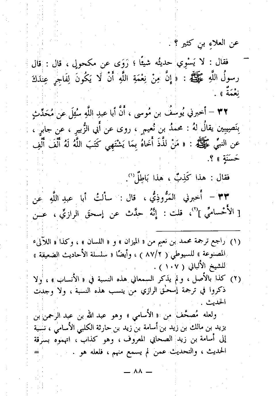 32 - أَخْبَرَنِي يُوسُفُ بْنُ مُوسَى، أَنَّ أَبَا عَبْدِ اللَّهِ سُئِلَ عَنْ مُحَدِّثٍ بِنَصِيبَيْنَ يُقَالُ لَهُ: مُحَمَّدُ بْنُ نُعَيْمٍ، رَوَى عَنْ أَبِي الزُّبَيْرِ، عَنْ جَابِرٍ، عَنِ النَّبِيِّ (صَلَّى اللَّهُ عَلَيْهِ وَسَلَّمَ): "مَنْ لَذَّذَ أَخَاهُ بِمَا يَشْتَهِي كَتَبَ اللَّهُ لَهُ أَلْفَ أَلْفَ حسنةٍ"؟.