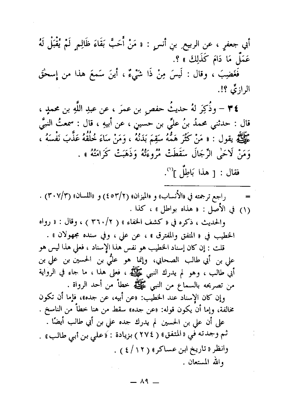 34 - وذكر لَهُ حَدِيثَ حَفْصِ بْنِ عُمَرَ، عَنْ عَبْدِ اللَّهِ بْنِ مُحَمَّدٍ، قَالَ: حَدَّثَنِي مُحَمَّدُ بْنُ عَلِيِّ بْنِ حُسَيْنٍ، عَنْ أَبِيهِ، قَالَ: سَمِعْتُ النَّبِيَّ (صَلَّى اللَّهُ عَلَيْهِ وَسَلَّمَ) يَقُولُ: "مَنْ كَثُرَ هَمُّهُ سَقَمَ بَدَنُهُ، وَمَنْ سَاءَ خُلُقُهُ عَذَّبَ نَفْسَهُ، وَمَنْ لاحَى الرِّجَالَ سَقَطَتْ مُرُوءَتُهُ وذهبت كرامته".