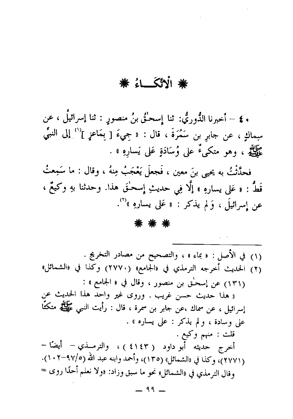 40 - أخبرنا الدُّورِيُّ: ثنا إِسْحَاقُ بْنُ مَنْصُورٍ: ثنا إِسْرَائِيلُ، عَنْ سِمَاكٍ، عَنْ جَابِرِ بْنِ سَمُرَةَ، قَالَ: "جِيءَ [بِمَاعِزٍ] إِلَى النَّبِيِّ (صَلَّى اللَّهُ عَلَيْهِ وسلم)، وهو متكىءٌ عَلَى وسادةٍ عَلَى يَسَارِهِ".