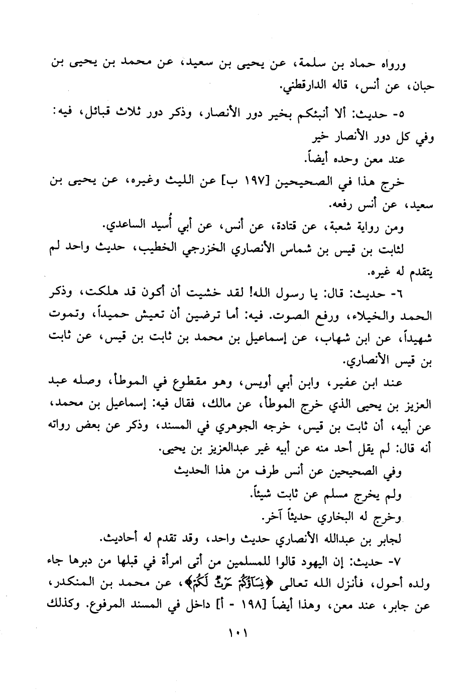 ٧ - حديث إن اليهود قالوا للمسلمين من أتى امرأة في قبلها من دبرها جاء ولده أحول، فأنزل الله تعالى {نساؤكم حرث لكم}، عن محمد بن المنكدر، عنجابر، عند معن، وهذا أيضاً [١٩٨ - أ] داخل في المسند المرفوع وكذلك