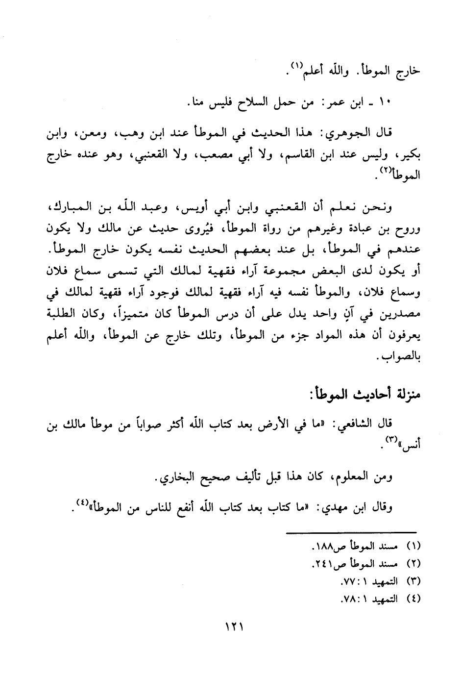 ونحن نعلم أن القعنبي وابن أبي أويس، وعبد الله بن المبارك، وروح بن عبادة وغيرهم من رواة الموطأ، فيُروى حديث عن مالك ولا يكون عندهم في الموطأ، بل عند بعضهم الحديث نفسه يكون خارج الموطأ. أو يكون لدى البعض مجموعة آراء فقهية لمالك التي تسمى سماع فلان وسماع فلان، والموطأ نفسه فيه آراء فقهية لمالك فوجود آراء فقهية لمالك في مصدرين في آنٍ واحد يدل على أن درس الموطأ كان متميزاً، وكان الطلبة يعرفون أن هذه المواد جزء من الموطأ، وتلك خارج عن الموطأ، والله أعلم بالصواب.