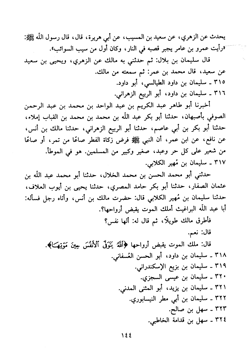 حدثني أبو محمد الحسن بن محمد الخلال، حدثنا أبو محمد عبد الله بن عثمان الصفار، حدثنا أبو بكر حامد المصري، حدثنا يحيى بن أيوب العلاف، حدثنا سليمان بن مُهير الكلابي قال: حضرت مالك بن أنس، وأتاه رجل فسأله: أبا عبد الله البراغيث أملك الموت يقبض أرواحها؟.