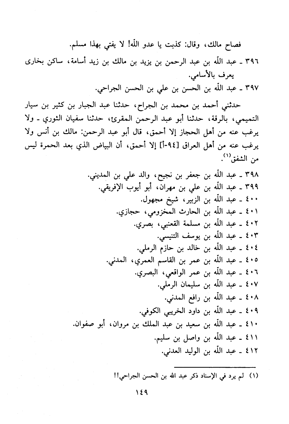 ٣٩٦ - عبد الله بن عبد الرحمن بن يزيد بن مالك بن زيد أسامة، ساكن بخارى يعرف بالأسامي