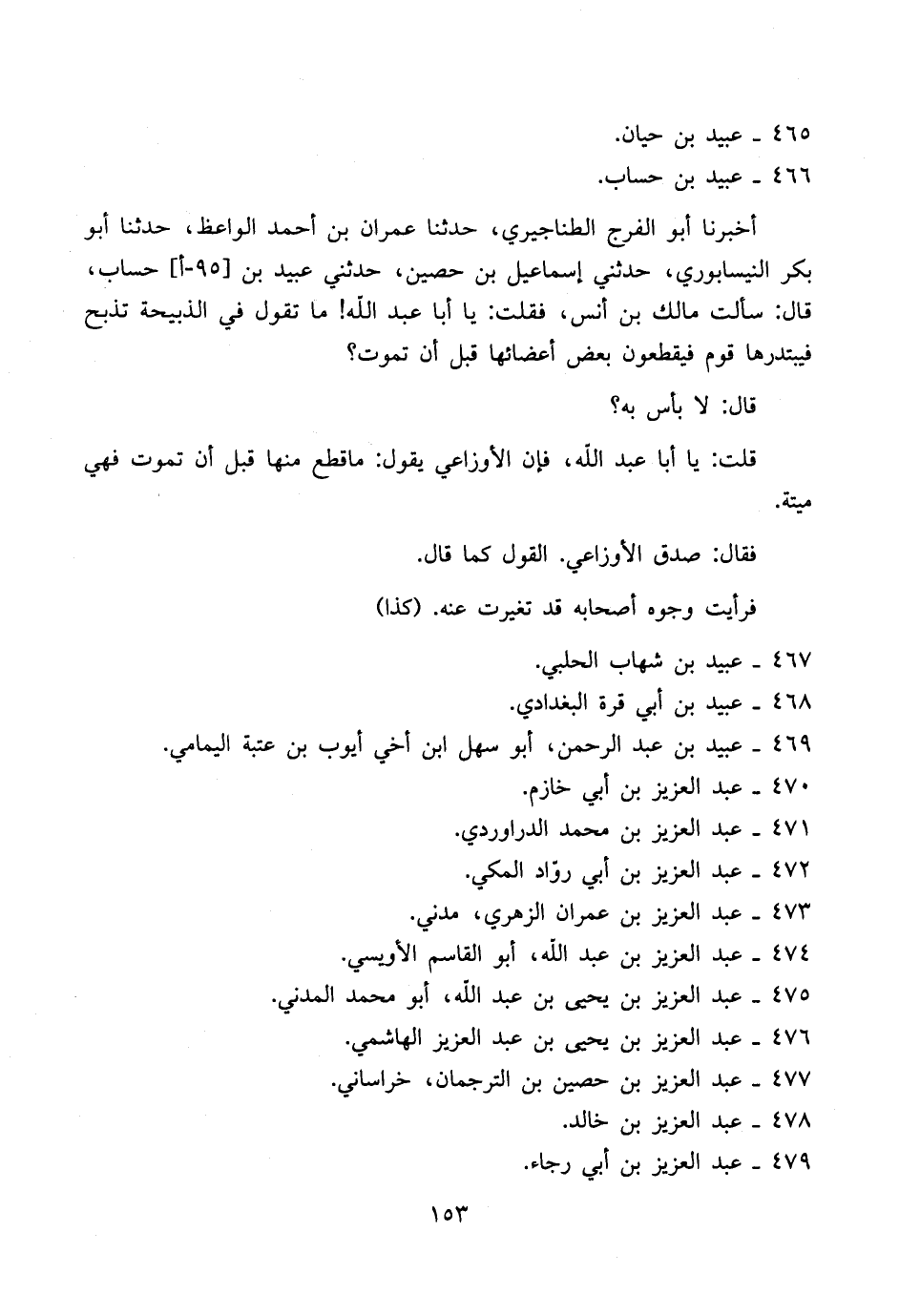 ٤٦٦ - عبيد بن حسابأخبرنا أبو الفرج الطناجيري، حدثنا عمران بن أحمد الواعظ، حدثنا أبو بكر النيسابوري، حدثني إسماعيل بن حصين، حدثني عبيد بن [٩٥ - أ] حساب، قال سألت مالك بن أنس، فقلت يا أبا عبد الله ما تقول في الذبيحة تذبح فيبتدرها قوم فيقطعون بعض أعضائها قبل أن تموت؟